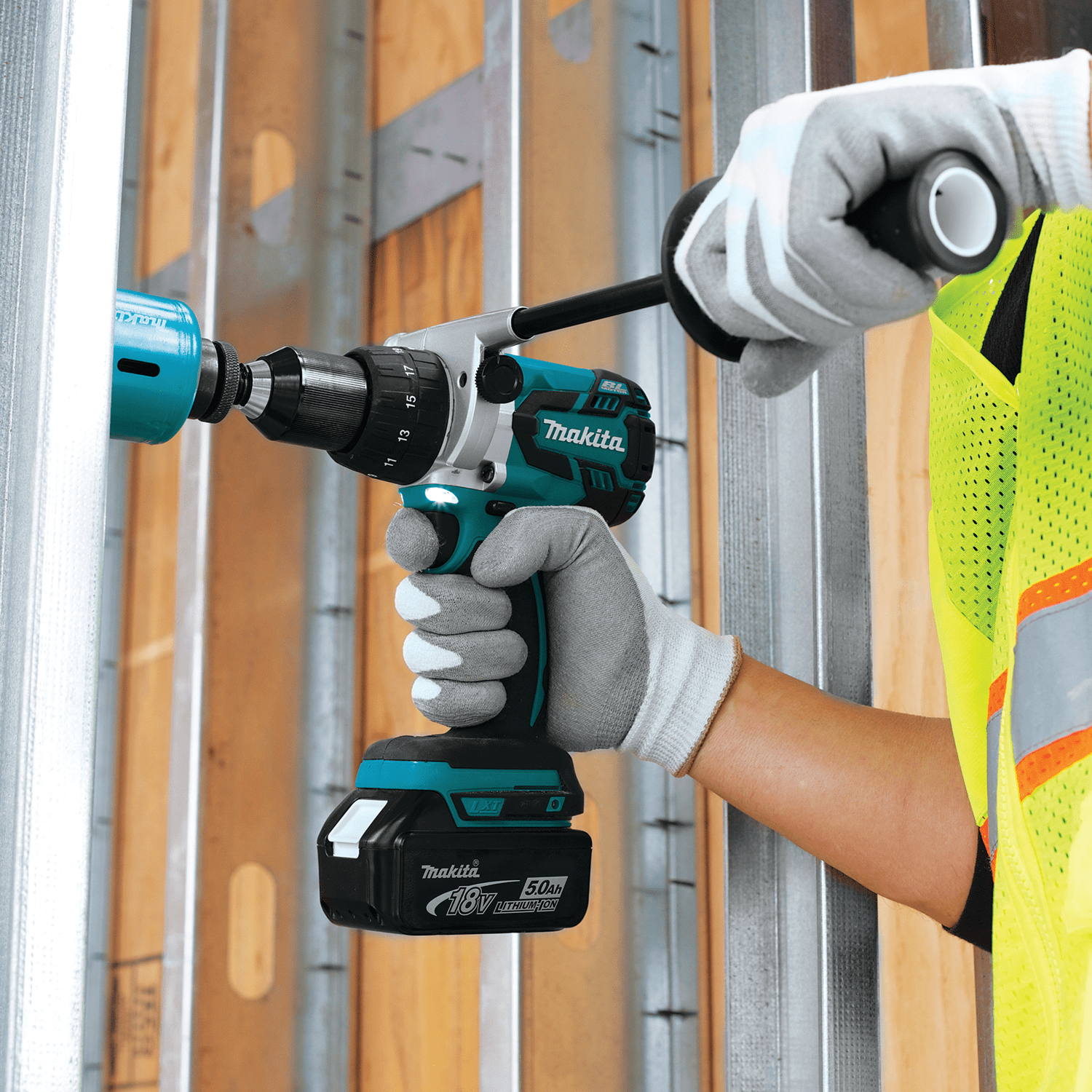 The 18V LXT® Lithium-Ion Cordless ½” Hammer Driver-Drill (model XPH07TB) breaks new ground with a full 1,090 in.lbs. of torque for the most demanding drilling and driving applications in wood, masonry and metal. It features a Makita BL™ Brushless Motor for longer run time, increased power and speed, and longer tool life. The XPH07TB is positioned at the top of Makita’s deep line-up of driver-drills, and is a workhorse tool engineered with durability features for operation in harsh job site conditions. The 18V LXT® 5.0Ah battery provides 65% more run time per charge than the 3.0Ah battery (BL1830), yet it charges in only 45 minutes – the fastest charge-time in the category – for less downtime and increased productivity. For added convenience, the battery features an integrated L.E.D. battery charge level indicator. It’s part of Makita’s expanding 18V Lithium-Ion series, the world’s largest cordless tool line-up powered by an 18V Lithium-Ion slide-style battery. Makita 18V Lithium-Ion batteries have the fastest charge times in their categories, so they spend more time working and less time sitting on the charger. For improved tool performance and extended battery life, Makita created Star Protection Computer Controls™. Star Protection is communication technology that allows the Star Protection-equipped tool and battery to exchange data in real time and monitor conditions during use to protect against overloading, over-discharging and overheating. For increased versatility, the tool can also be powered by Makita 18V LXT® and Compact Lithium-Ion batteries with the star symbol on the battery indicating Star Protection inside. BL™ Brushless Motor delivers 1,090 in.lbs. of Max Torque. 0-31,500 BPM for fast hammer drilling in masonry materials. Efficient BL™ Brushless motor is electronically controlled to optimize battery energy use for up to 50% longer run time per charge. The BL™ Brushless Motor eliminates carbon brushes, enabling the BL™ Motor to run cooler and more efficiently for longer life. The electronically-controlled BL™ Brushless Motor efficiently uses energy to match torque and RPM to the changing demands of the application. All metal variable 2-speed transmission (0-550 & 0-2,100 RPM) for a wide range of drilling, fastening and hammer drilling applications. All metal gears and gear housing for maximum job site durability. All metal 1/2" ratcheting chuck for improved bit gripping strength and durability. Compact and ergonomic design at only 8-1/8" long. Weighs only 5.9 lbs. with battery for reduced operator fatigue. Features Extreme Protection Technology (XPT™) which is engineered to provide increased dust and water resistance in harsh job site conditions. Rubberized soft grip provides increased operator comfort. Dual L.E.D. lights illuminate the work area. 18V LXT® Lithium-Ion 5.0Ah battery BL1850B features an integrated L.E.D. battery charge level indicator. 18V LXT® Lithium-Ion 5.0Ah battery BL1850B provides up to 65% more run time per charge*. 18V LXT® Lithium-Ion 5.0Ah battery BL1850B reaches a full charge in 45 minutes or less. Equipped with Star Protection Computer Controls™ to protect against overloading, over-discharging and over-heating. Rapid Optimum Charger communicates with the battery's built-in chip throughout the charging process to optimize battery life by actively controlling current, voltage and temperature. Rapid Optimum Charger has a built-in fan to cool the battery for faster, more efficient charging. Makita technology delivers category-leading charge time so the battery spends more time working and less time sitting on the charger. Compatible with Makita 18V Lithium-Ion batteries with a Star symbol. 3-year limited warranty on tool, battery and charger. **compared to LXPH03. *compared top BL1830. Only use genuine Makita batteries and chargers.