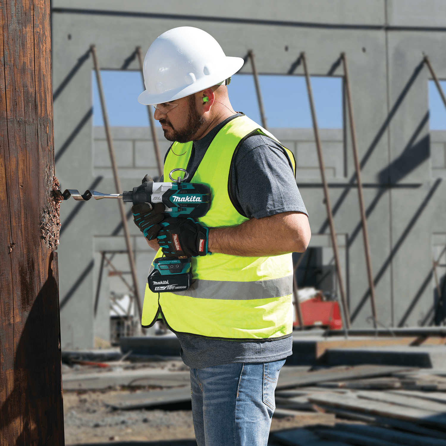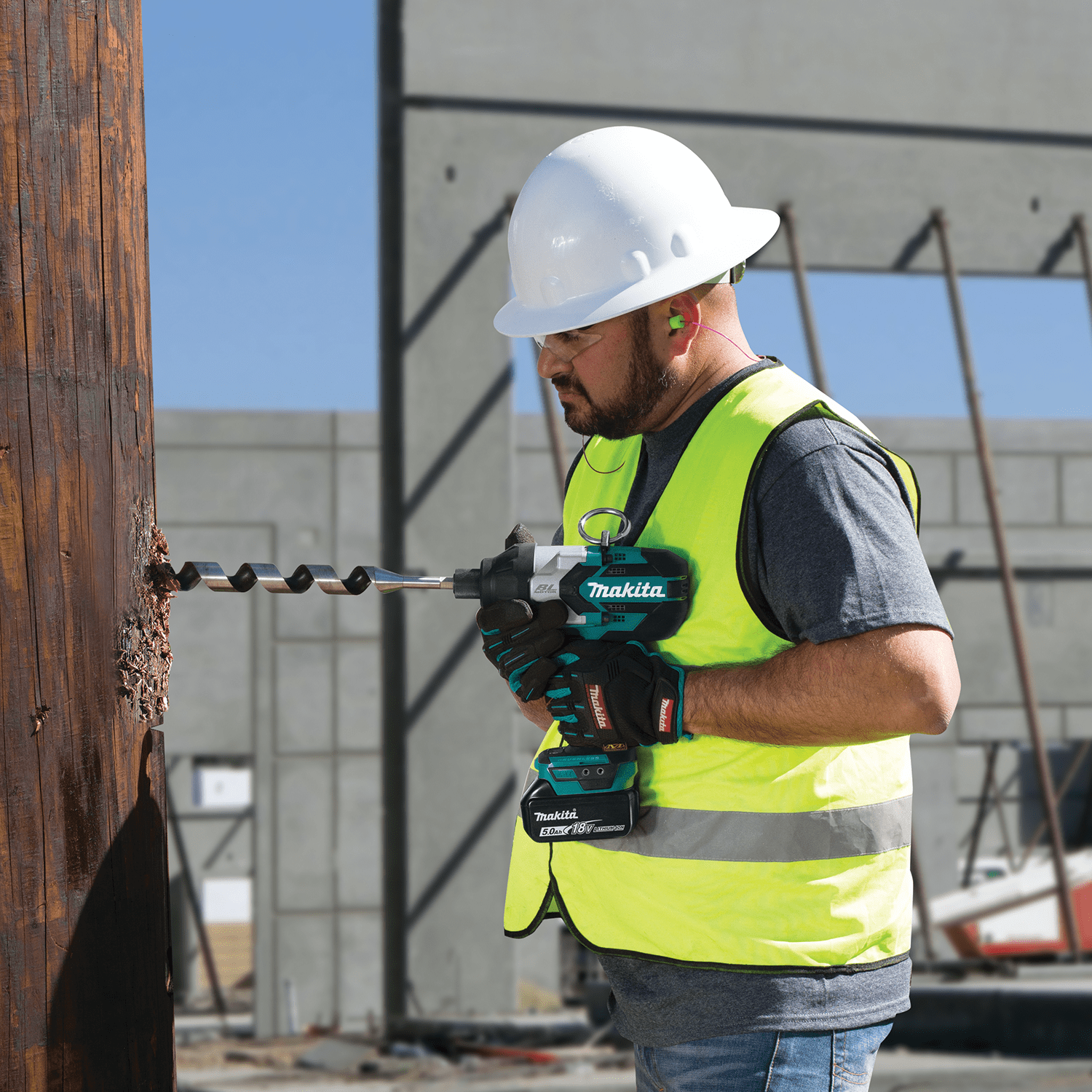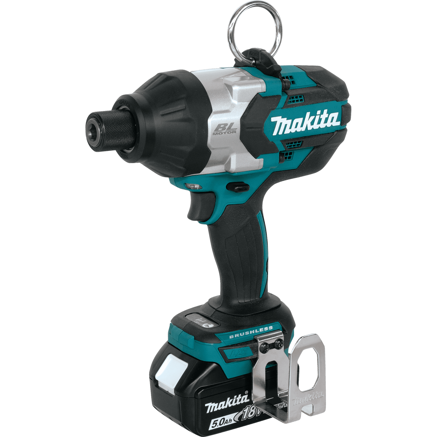 The Makita 18V LXT® Lithium-Ion Brushless Cordless High Torque 7/16" Hex Chuck Impact Wrench Kit (XWT09T) combines 590 ft.lbs. fastening torque with extended run time and speed control for unmatched fastening performance. It features an efficient Makita brushless motor for longer run time, increased power and speed, and longer tool life. The electronic 3-speed power selection switch gives users more precise fastening control. With the 7/16” hex chuck and hanging ring, it is ideal for linemen and electricians for installation and maintenance of power lines, wood boring, and more. It’s part of Makita’s expanding 18V Lithium-Ion system, the world’s largest cordless tool system powered by 18V Lithium-Ion slide-style batteries. Makita 18V Lithium-Ion batteries have the fastest charge times in their categories, so they spend more time working and less time sitting on the charger. For improved tool performance and extended battery life, Makita created Star Protection Computer Controls™. Star Protection is communication technology that allows the Star Protection-equipped tool and battery to exchange data in real time and monitor conditions during use to protect against overloading, over-discharging and overheating. For increased versatility, the tool can also be powered by Makita 18V LXT® and Compact Lithium-Ion batteries with the star symbol on the battery indicating Star Protection inside. BL™ Brushless Motor delivers 590 ft.lbs. of fastening torque. 3-speed power selection switch (0-900/ 0-1,000/ 0-1,800 RPM & 0-1,800/ 0-2,000/ 0-2,200 IPM) provides precise fastening control for a wide range of applications. Efficient BL™ Brushless motor is electronically controlled to optimize battery energy use for up to 50% longer run time per charge. The BL™ Brushless Motor eliminates carbon brushes, enabling the BL Motor to run cooler and more efficiently for longer life. The electronically-controlled BL™ Brushless Motor efficiently uses energy to match torque and RPM to the changing demands of the application. Compact and ergonomic design at only 9" long. Weighs only 8.1 lbs. with battery for reduced operator fatigue. Rubberized soft grip handle provides increased comfort on the job. Built-in dual L.E.D. lights with preglow and afterglow illuminates the work area. Easy to operate forward/reverse switch. Electric brake for maximum productivity. Tool hook secures the tool when not in use. Hanging ring on tool for user convenience. Makita's proprietary hammer and anvil impact mechanism are manufactured using the best raw materials with the highest quality steel and unique heat hardening process for maximum fastening and driving power. 18V LXT® Lithium-Ion 5.0Ah battery BL1850B, features an integrated L.E.D. battery charge level indicator. 18V LXT® Lithium-Ion 5.0Ah battery BL1850B provides up to 65% more run time per charge*. 18V LXT® Lithium-Ion 5.0Ah battery BL1850B reaches a full charge in 45 minutes or less. Equipped with Star Protection Computer Controls™ to protect against overloading, over-discharging and over-heating. Rapid Optimum Charger communicates with the battery's built-in chip throughout the charging process to optimize battery life by actively controlling current, voltage and temperature. Rapid Optimum Charger has a built-in fan to cool the battery for faster, more efficient charging. Makita technology delivers category-leading charge time, so the battery spends more time working and less time sitting on the charger. Compatible with Makita 18V Lithium-Ion batteries with a Star symbol. 3-year limited warranty on tool, battery and charger. Only use genuine Makita batteries and chargers. *compared to BL1830.