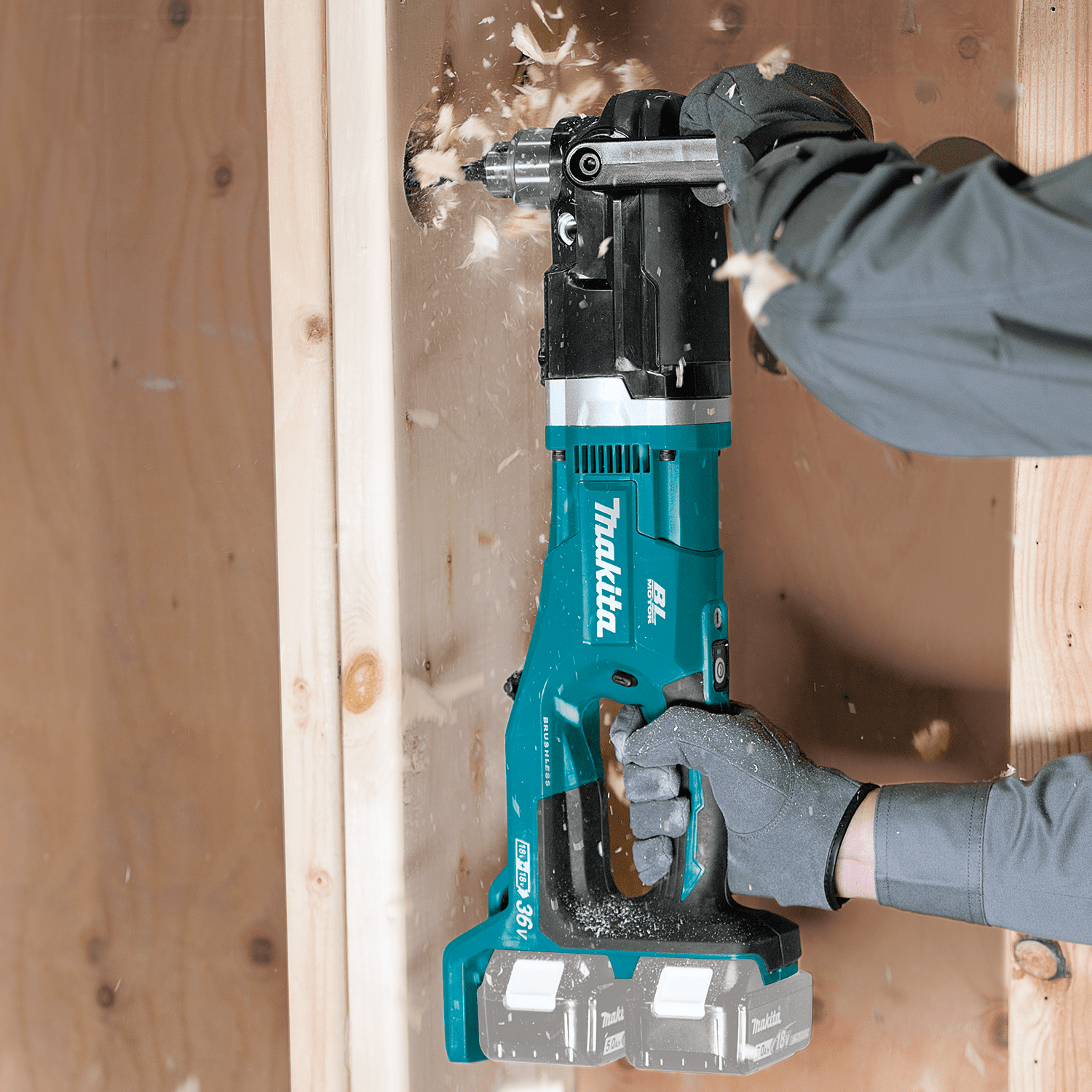 Makita, a pioneer in brushless motor technology and battery innovation, combines both in the 18V X2 LXT® (36V) Lithium-Ion Brushless Cordless ½” Right Angle Drill. It's powered by two 18V LXT® Lithium-Ion batteries (batteries sold separately) for maximum performance, and has an electronically-controlled BL™ Brushless motor that matches torque and RPM to the changing demands of the application. Makita 18V X2 means freedom from the cord, and the XAD03 will take on the most demanding applications like drilling up to 6-1/4” holes with hole saws and 4-5/8” holes with self-feed bits. Best of all, users can remain in one battery platform, using the same fast-charging 18V batteries with the XAD03 as they use across the expansive Makita 18V LXT® cordless system. The XAD03 has a long list of features for drilling with superior speed and efficiency. The Makita BL™ Brushless Motor combined with X2 LXT® technology delivers no-load drilling speeds of 0-350 RPM and 0-1,400 RPM. Under load, the Automatic Speed Change™ technology adjusts drill speed and torque during drilling for optimum performance. Added features include an electric brake for maximum productivity, and a built-in clutch that reduces gear damage by disengaging gears if the bit binds (low speed only). It’s powered by two 18V LXT batteries for maximum power, speed and run time without the hassles of a cord. When using two 18V 5.0Ah batteries and a self-feed bit (batteries and bit sold separately), the XAD03 will deliver up to 160 2-9/16" holes per charge in 2x SPF. It’s part of Makita’s expanding 18V Lithium-Ion system, the world’s largest cordless tool system powered by 18V Lithium-Ion slide-style batteries. Makita 18V Lithium-Ion batteries have the fastest charge times in their categories, so they spend more time working and less time sitting on the charger. For improved tool performance and extended battery life, Makita created Star Protection Computer Controls™. Star Protection is communication technology that allows the Star Protection-equipped tool and battery to exchange data in real time and monitor conditions during use to protect against overloading, over-discharging and overheating. For increased versatility, the tool can also be powered by Makita 18V LXT® and Compact Lithium-Ion batteries with the star symbol on the battery indicating Star Protection inside. Powered by two LXT® batteries; X2 LXT® technology delivers more power, speed and run time without the hassles of a cord (batteries not included). Drills up to 6-1/4" holes with hole saws and 4-5/8" holes with self feed bits. Drills up to 160 2-9/16" holes per charge in 2x SPF using two 5.0Ah batteries and self feed bit (batteries and bit not included). Makita BL™ Brushless Motor combined with X2 LXT® technology delivers no-load drilling speeds of 0-350 RPM and 0-1,400 RPM for maximum efficiency. Automatic Speed Change™ technology adjusts drill speed and torque during drilling for optimum performance. Extreme Protection Technology (XPT™) is engineered for improved dust and water resistance for operation in harsh conditions. Metal-gear housing increases tool durability and extends reliability. Torque limiter; built-in clutch reduces gear damage by disengaging gears if the bit binds (low speed only). Electric brake for maximum productivity. Variable 2-speed design (0-350 RPM and 0-1,400 RPM) for optimum speed control and drilling versatility. Built-in L.E.D. light illuminates the work area. Built-in tether notch (tether sold separately). Includes chuck key with convenient on-tool storage. Auto power-off feature preserves battery and tool life. Adjustable top handle for easy positioning. Ergonomically designed handle with rubberized soft grip provides increased comfort on the job. Includes side handle for better bracing and control. Compact and ergonomic design at 21-1/4" long; weighs only 14.0 lbs. with batteries (batteries not included) for reduced operator fatigue. Efficient BL™ Brushless motor is electronically controlled to optimize battery energy use for up to 50% longer run time per charge. The BL™ Brushless Motor eliminates carbon brushes, enabling the BL™ Motor to run cooler and more efficiently for longer life. The electronically-controlled BL™ Brushless Motor efficiently uses energy to match torque and SPM to the changing demands of the application. Equipped with Star Protection Computer Controls™ to protect against overloading, over-discharging and over-heating. Makita technology delivers category-leading charge time so the battery spends more time working and less time sitting on the charger (battery and charger sold separately). Rapid Optimum Charger communicates with the battery's built-in chip throughout the charging process to optimize battery life by actively controlling current, voltage and temperature (battery and charger sold separately). Rapid Optimum Charger has a built-in fan to cool the battery for faster, more efficient charging (battery and charger sold separately).