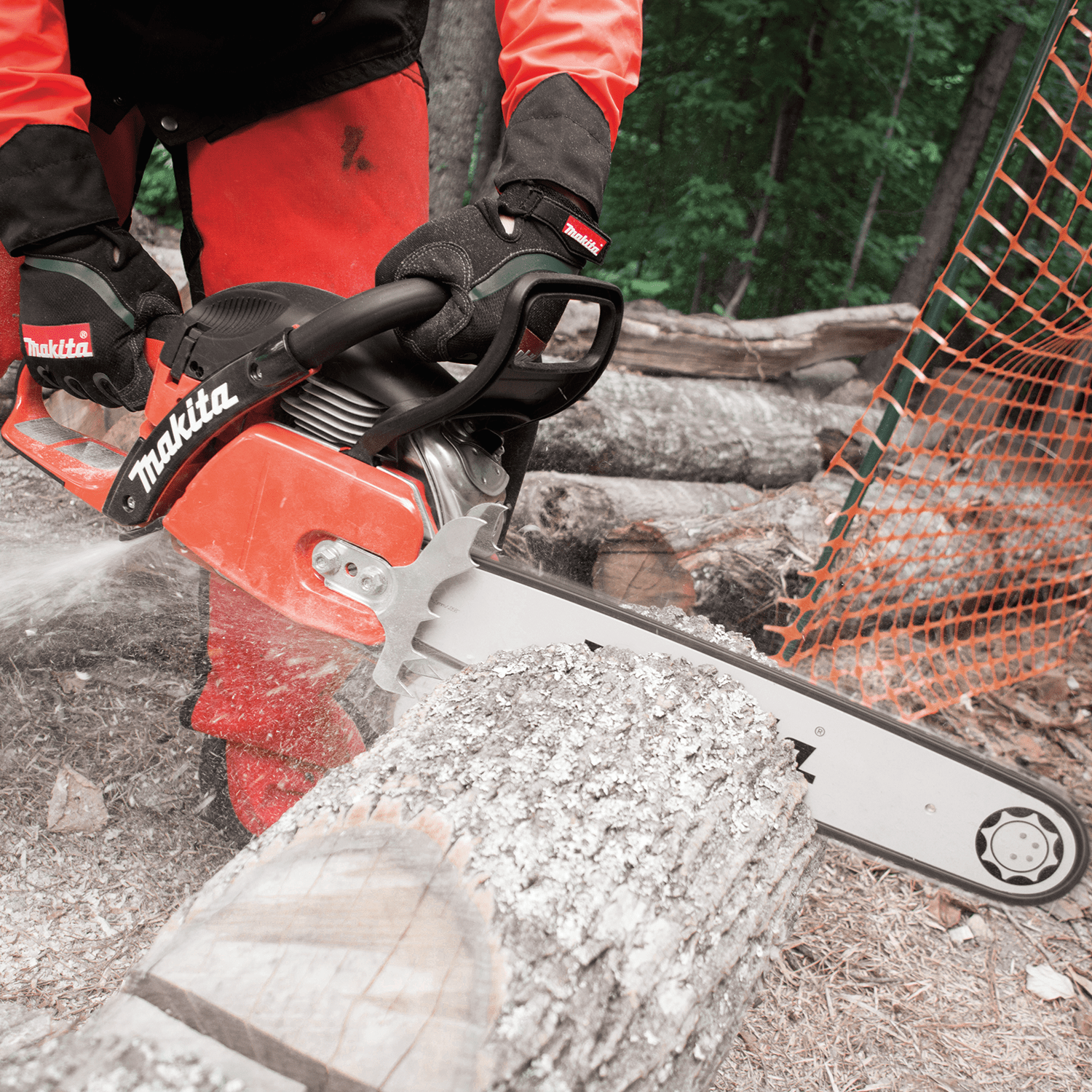 The Makita 20” 50cc Chain Saw (EA5000PRGG) combines a high power-to-weight ratio with easier starts and less vibration for a full range of applications. The 50cc engine delivers 3.9 HP, with an Easy Start spring-assisted starter. The Touch & Stop single-lever operation is engineered for immediate shut-off for added convenience. Additional features include an easy-to-clean chain compartment for efficient clearing of chips, even when rip cutting, and the advanced vibration dampening system that is engineered to reduce vibration. Magnesium housing for improved durability and less weight (only 11.9 lbs.). Easy Start spring-assisted starter with optimized engine management for quick starting with less force. 13,800 RPM with faster acceleration for more efficient cutting performance. Compact design engineered with smooth rounded surfaces for easy cleaning and operator comfort. Large dual spike bar for increased productivity. Touch & Stop single lever control shuts off engine with just a touch. Slide-out baffle can be configured for efficient cold weather operation. Two point durable inertia/mechanical chain brake. Chain compartment is easy to clean and clears chips away efficiently. Lateral chain tensioning for easy adjustment. Advanced Vibration Dampening System engineered to reduce vibration. Large fuel and oil tank openings with S-form caps for easy operation. Adjustable automatic chain lubrication for efficient operation. Reversible sprocket nose bar with oil retaining feature for improved bar and chain lubrication. Floating rim sprocket for easy maintenance and improved chain life.