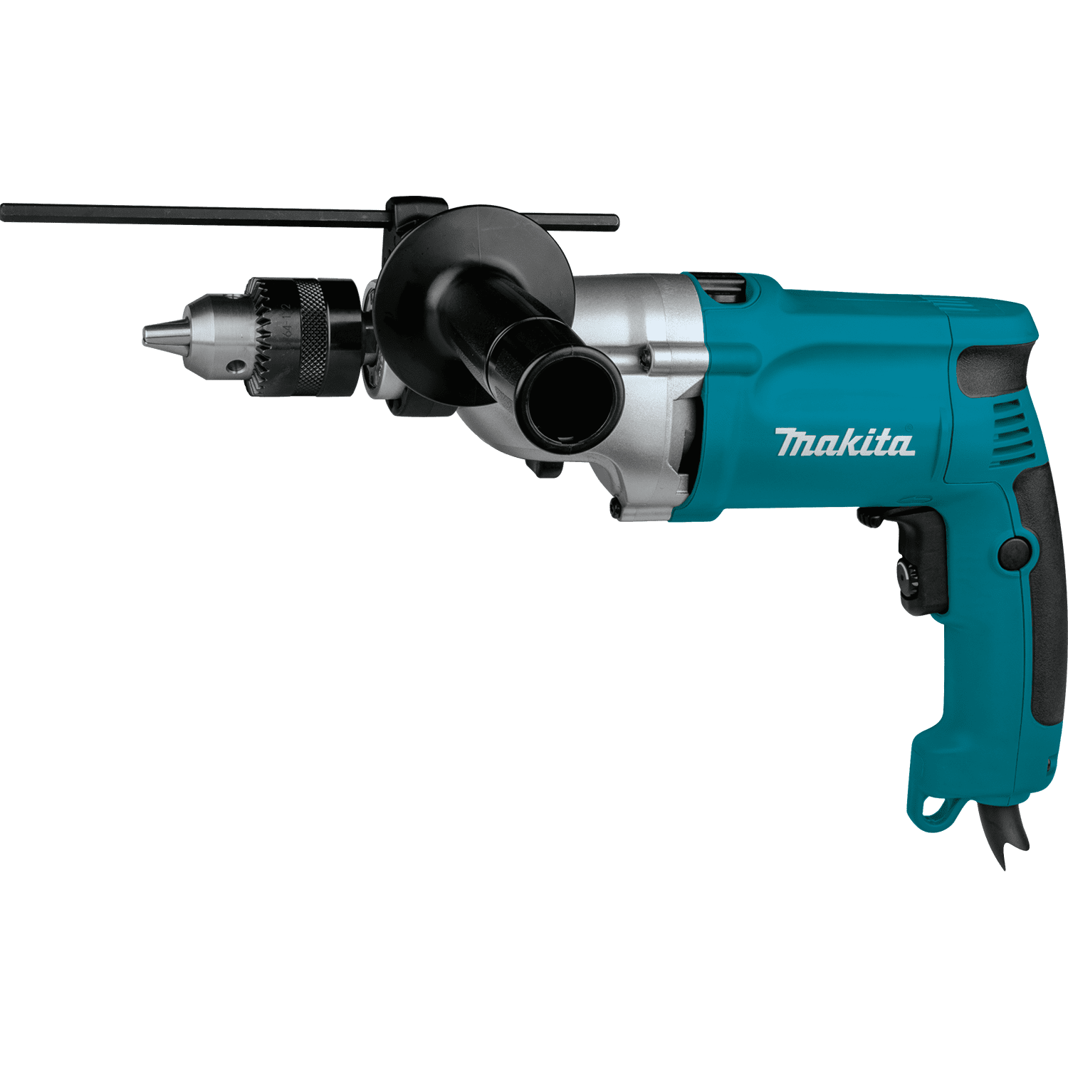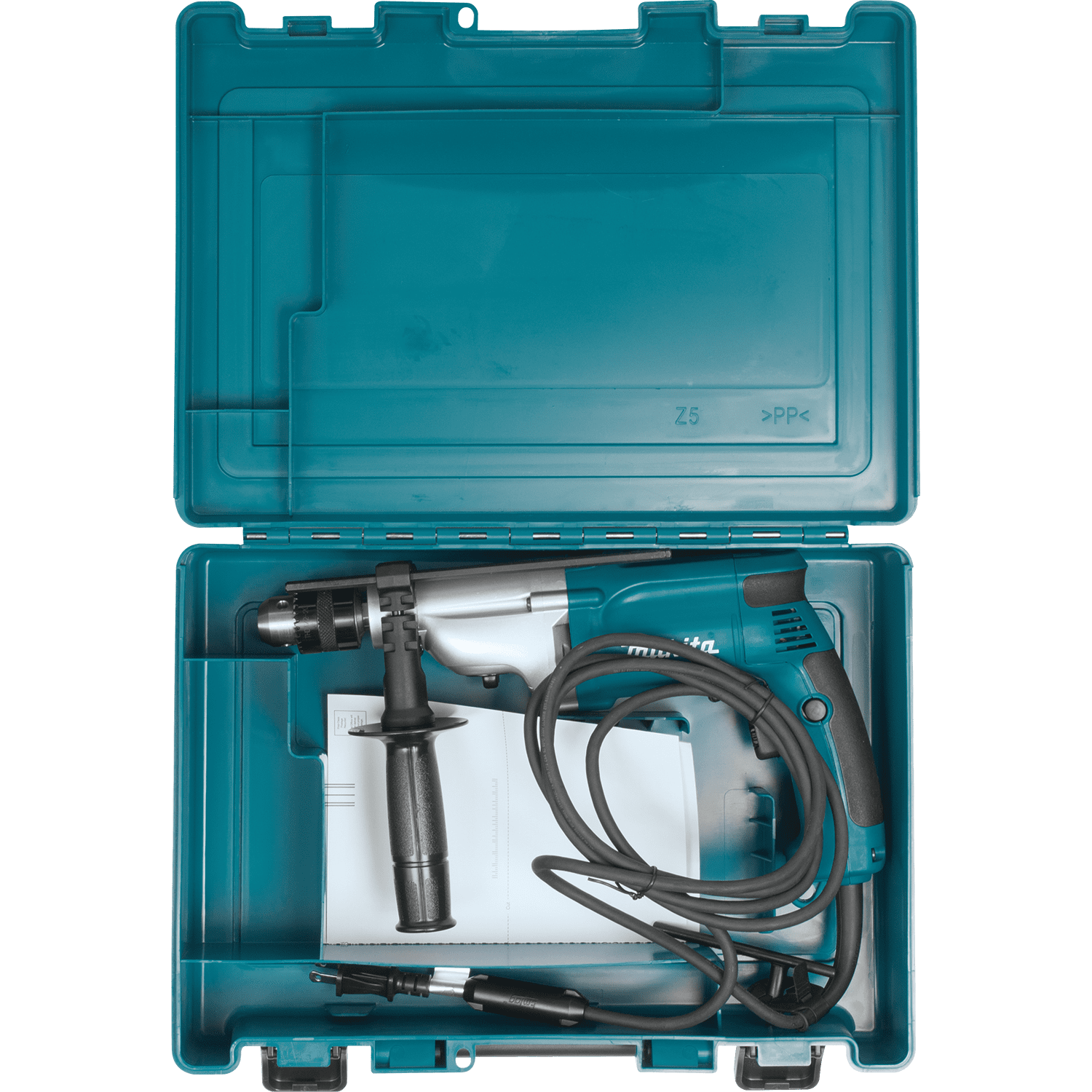 The Makita 3/4 in. Hammer Drill is powered by a 6.6 AMP motor that is engineered for the most demanding applications. The HP2050F features a torque-limiting clutch that disengages automatically if the bit binds, and two-mode operation for "hammering with rotation" or "hammering only." Additional features include less weight (only 5.6 lbs.), a large trigger switch, and an ergonomic rubberized grip for increased comfort. The HP2050F also features an LED light for improved visibility, and a variable speed dial that allows the user to match the speed to the application. Powerful 6.6 AMP motor for the most demanding applications. Conveniently-located 2-mode switch allows for fast mode changes between "Rotation Only" and "Hammering with Rotation". Variable 2-speed (0-1,200 & 0-2,900 RPM) with variable speed control dial. Built-in clutch engineered to reduce gear damage by automatically disengaging gears if bit binds. Built-in L.E.D. light illuminates the work area. Positive stop mode selector prevents accidental mode disengagement. Large trigger switch and 360° swivel side handle for added comfort. Recessed lock-on button for continuous use. All-ball bearing construction for longer tool life. Ergonomic rubberized grip for increased comfort on the job. Lightweight (5.6 lbs.) for reduced operator fatigue. Designed for low noise and reduced vibration. Air vent holes supply required ventilation while protecting motor from dust and debris.