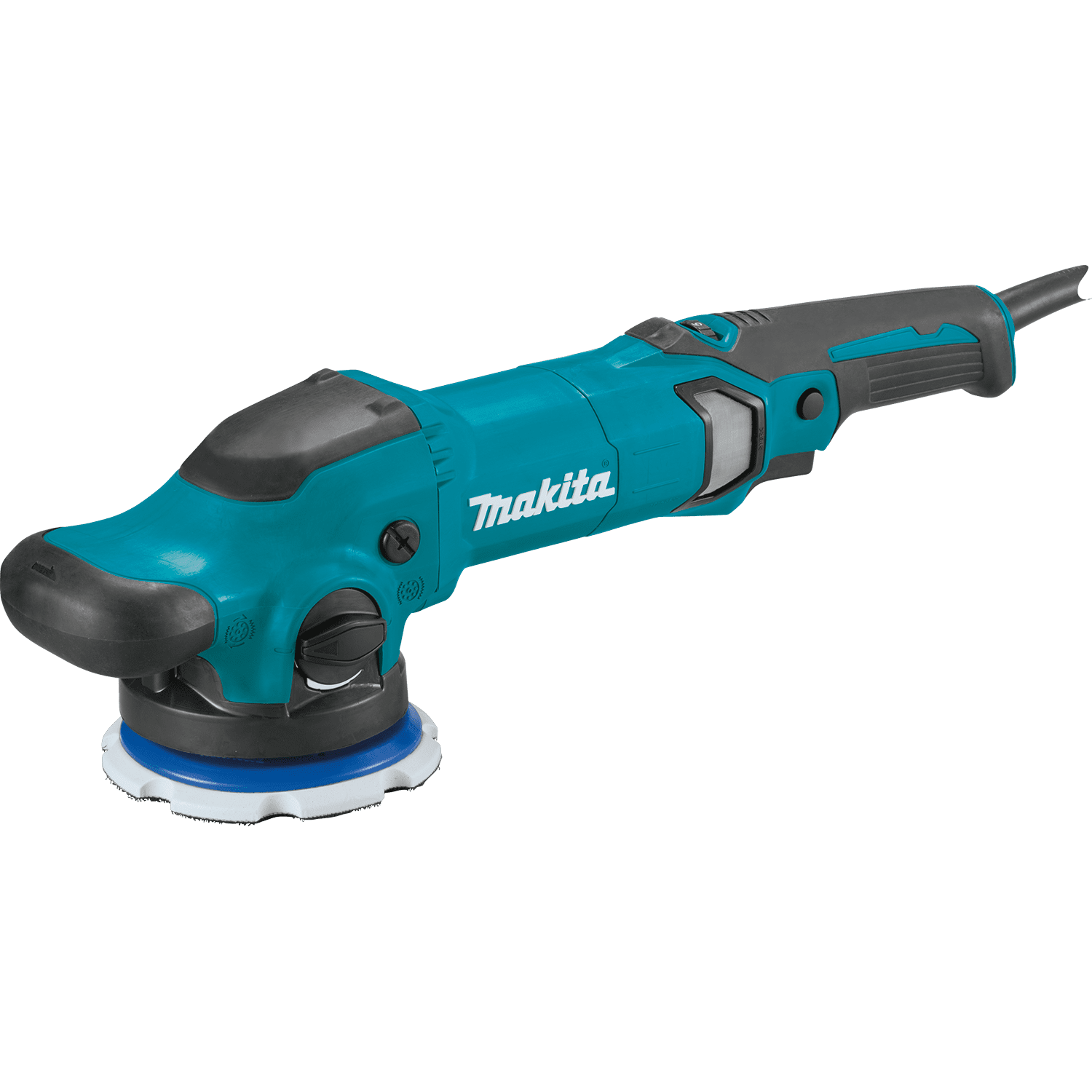 Makita polishers are preferred by automotive detailers and marine enthusiasts, and the 5” Dual Action Random Orbit Polisher (PO5000C) is packed with enhanced features for consistent performance, job after job. The dual action control offers “random orbit with forced rotation” or “random orbit with free rotation”, and the variable speed control dial has five speed settings so users are able to set the speed and action to the application. Additional performance features include an electronic controller that automatically applies additional power to maintain constant speed, even under load, and also provides soft start for smoother start-ups and longer gear life. For added convenience the Polisher has an ergonomic knob handle and rubberized back handle with lock-on switch, and a rubberized tool rest for upside-down placement of the tool. It is ideal for commercial-duty polishing applications. Powerful 7.8 AMP motor delivers more output and variable (0 - 780) RPM. 7/32" (5.5mm) orbit diameter provides a swirl-free finish. Conveniently located variable speed control dial (0 - 6,800 OPM) enables the operator to match the speed to the application. Electronic controller provides constant speed control which automatically applies additional power to the motor to maintain speed under load. Electronic Controller provides soft start which is designed to suppress start-up reaction for smooth start-ups and longer gear life. Air vent intake covers help prevent fibers from entering the motor. Ergonomically designed knob handle provides precision and control in a variety of applications. Rubberized back handle with conveniently located lock-on switch for continuous use and increased operator comfort. Cord guard for increased flexibility and longer life. Rubber tool rest for upside down placement of tool. Double insulated cord helps prevent static electricity accumulation.