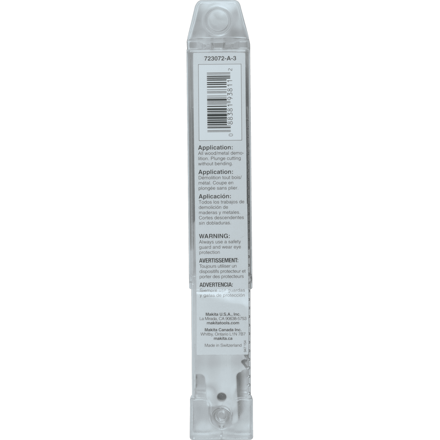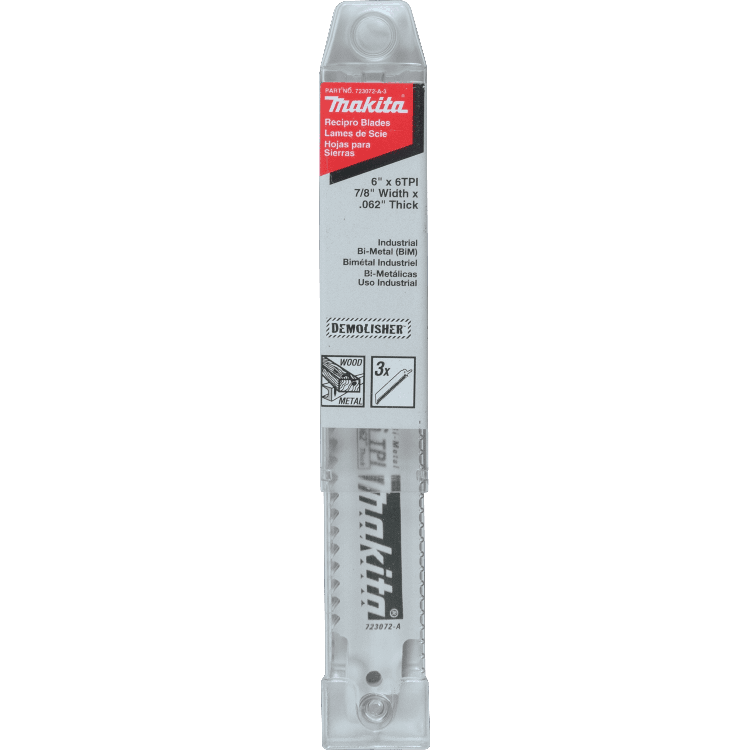 Makita Demolisher™ reciprocating saw blades are engineered for the most demanding of demolition applications. The fully reinforced teeth and cobalt content minimize teeth breakage and increases durability. Added blade thickness increases its resistance to bending. Cobalt content set to maximize blade durability and wear in high impact demolition applications. Additional 7/8 in. width increases blade life. First tooth consistently centered on each blade for straight plunge cuts. Fully reinforced teeth minimizes teeth breakage. .062 in. thickness increases resistance to bending. Bi-Metal construction lasts 10 times longer than HCS blades. For making demolition cuts without the blade bending in nail embedded wood and drywall.