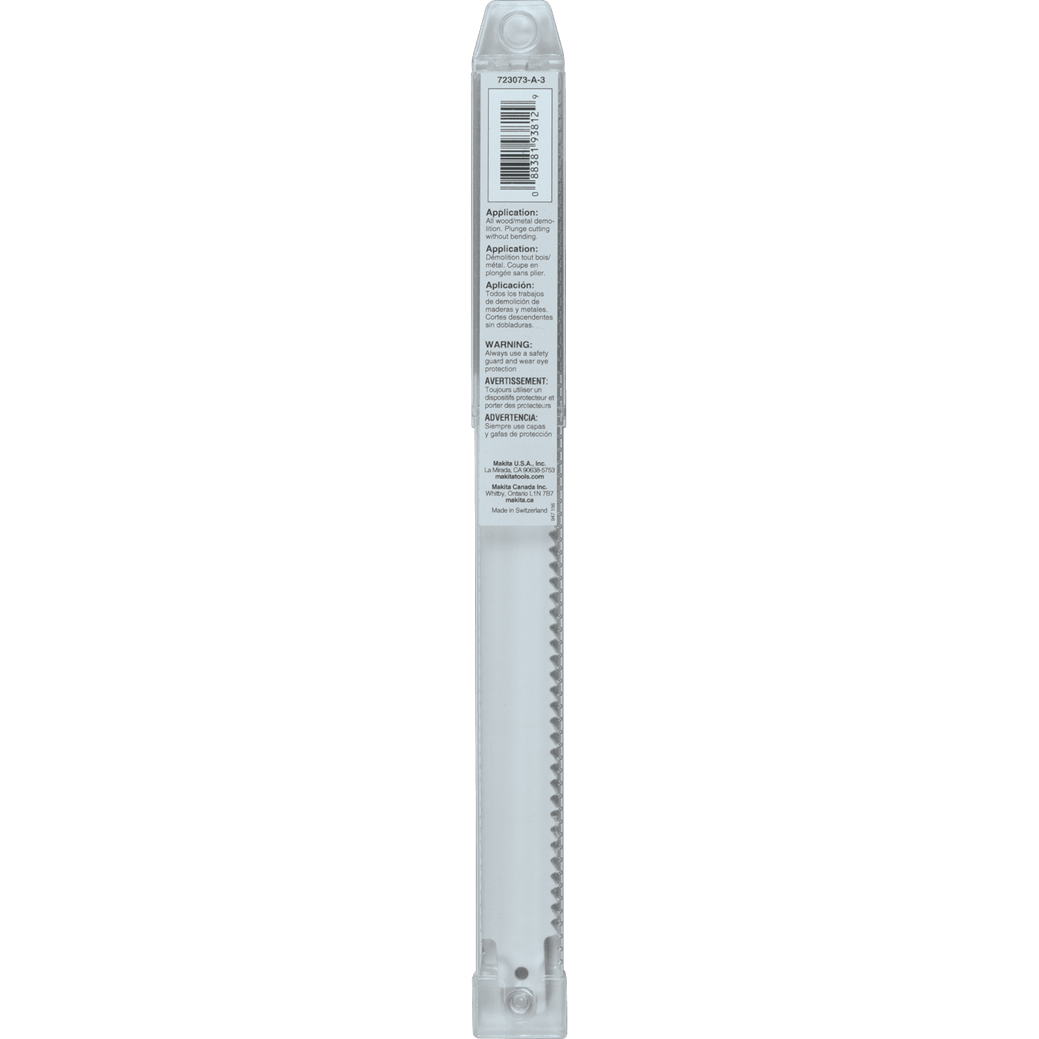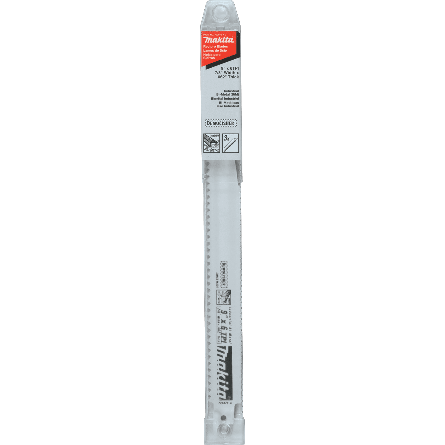 Makita Demolisher™ reciprocating saw blades are engineered for the most demanding of demolition applications. The fully reinforced teeth and cobalt content minimize teeth breakage and increases durability. Added blade thickness increases its resistance to bending. Cobalt content set to maximize blade durability and wear in high impact demolition applications. Additional 7/8 in. width increases blade life. First tooth consistently centered on each blade for straight plunge cuts. Fully reinforced teeth minimizes teeth breakage. .062 in. thickness increases resistance to bending. Bi-Metal construction lasts 10 times longer than HCS blades. For making demolition cuts without the blade bending in nail embedded wood and drywall.