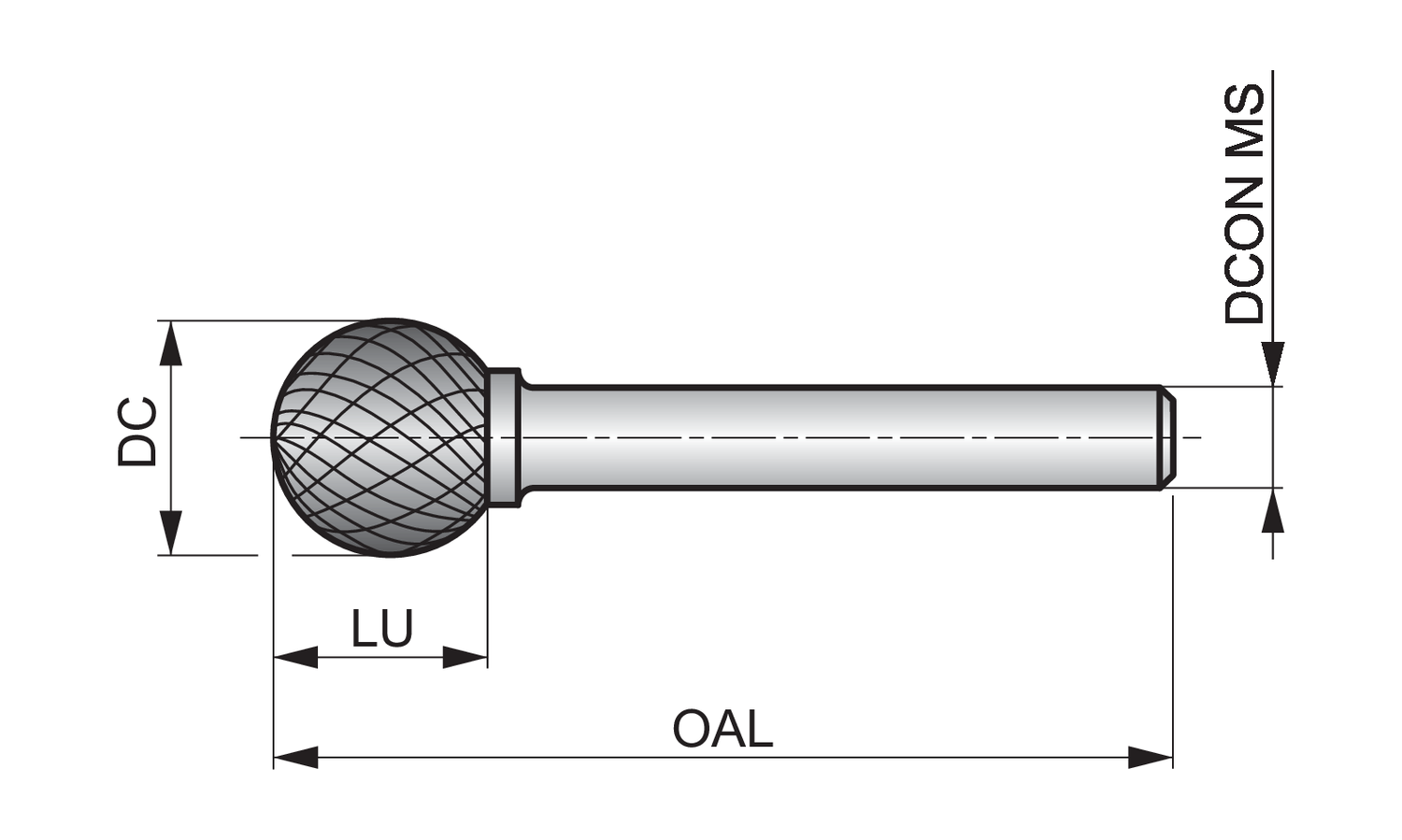 Ball burr (D shape), diameter 6.3mm with 5mm length of cut, 38mm overall length and 3mm shank, carbide tipped with toughened and hardened steel shank and bright finish, DC double cut flute style with close spaced edges for intricate carving, metal engraving and welding preparation in steel and cast steel, stainless steel, cast-iron, copper or copper alloys, high-temperature alloys, hardened materials