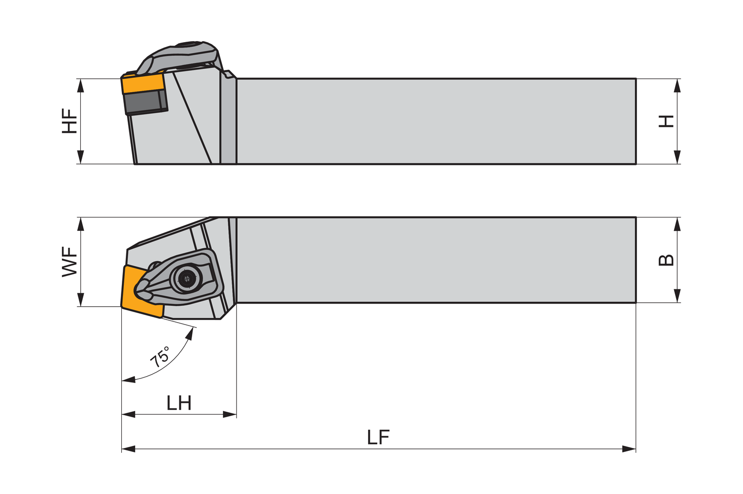 Double clamp turning tool for holding a 80° rhombus negative insert with an inscribed circle diameter of 5/8'', 1/4'' thick (ANSI designation CN.. 54. ), right hand 75° side cutting with off-set shank, 1.1/4'' tool height x 1.1/4'' width x 6'' long for chamfering, taper turning and longitudinal turning without shoulder