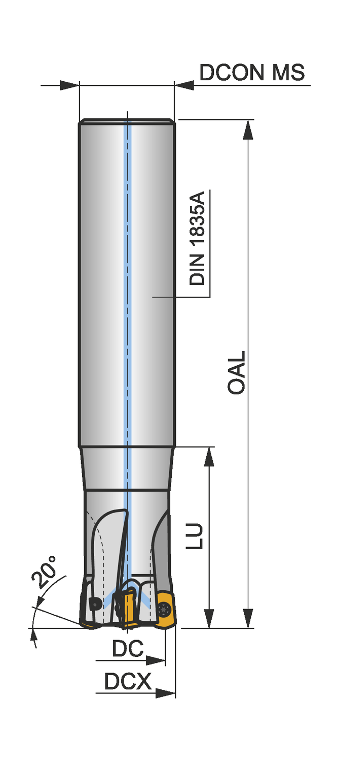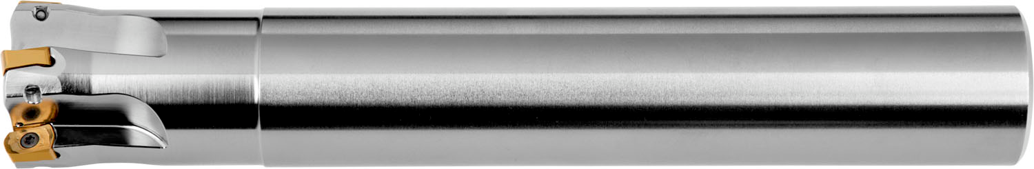 High feed cutter with positve/negative geometry which utilises 4 off BNGX 10T3.. or ANHX 10T3.. inserts, cutting diameter 20mm with 20° approach angle and 20mm parallel shank according to DIN 1835A, 40mm functional and 130mm overall length, through coolant for face milling, copy milling, shallow shoulder milling, ramping, helical milling, plunge milling and progressive plunge milling with a maximum depth of cut of 1.0mm