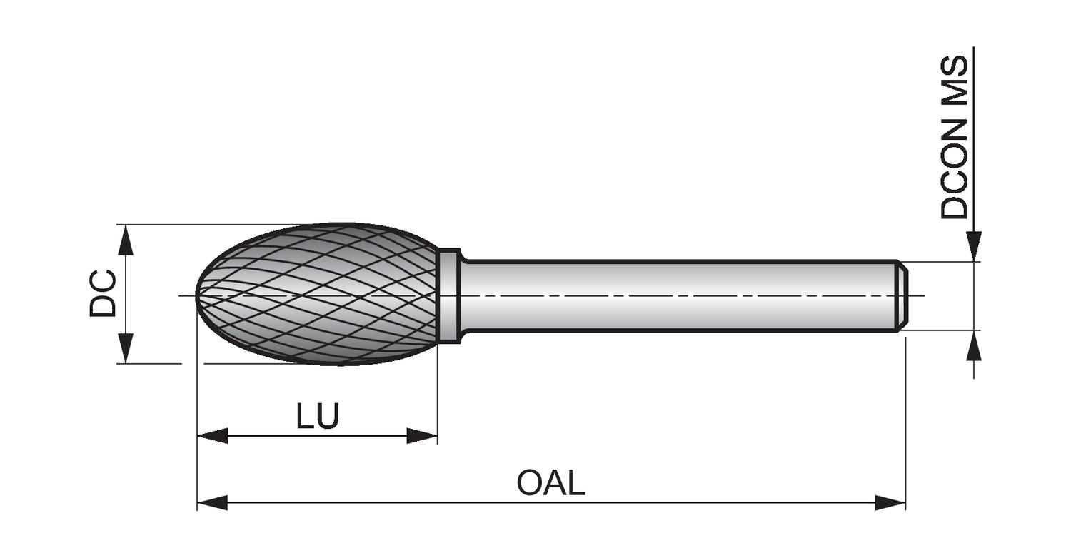 Oval burr (E shape), diameter 12.7mm with 22mm length of cut, 67mm overall length and 6mm shank, carbide tipped with toughened and hardened steel shank and bright finish, DC double cut flute style with close spaced edges for round edge contouring in steel and cast steel, stainless steel, cast-iron, copper or copper alloys, high-temperature alloys, hardened materials
