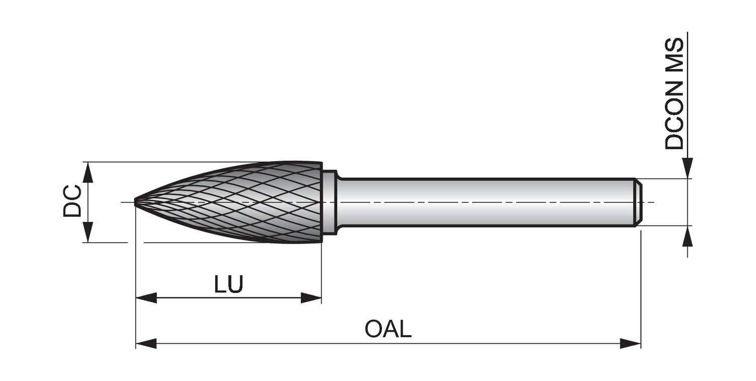 Pointed tree burr (G shape), diameter 6.3mm with 12.7mm length of cut, 45mm overall length and 3mm shank, carbide tipped with toughened and hardened steel shank and bright finish, DC double cut flute style with close spaced edges for multi-angle contouring and cutting narrow angles in hard to reach areas in steel and cast steel, stainless steel, cast-iron, copper or copper alloys, high-temperature alloys, hardened materials