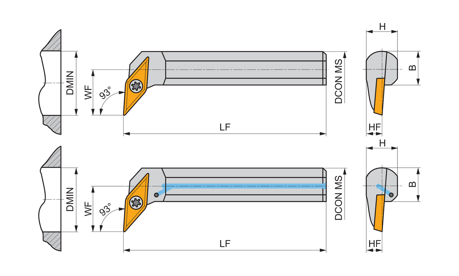 Screw clamp boring bar for holding a 35° rhombus positive insert with an inscribed circle diameter of 6.35mm, 3.18mm thick (ISO designation VB.. 1103.. ), left hand 93° end cutting with off-set shank, steel with coolant hole, 20mm diameter x 250mm long for single and multi-directional copy boring and back chamfering