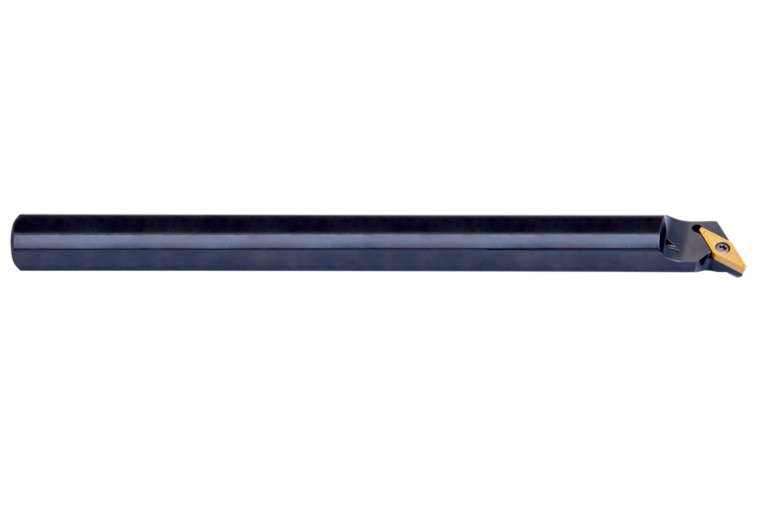 Screw clamp boring bar for holding a 35° rhombus positive insert with an inscribed circle diameter of 7.94mm, 3.18mm thick (ISO designation VC.. 1303.. ), left hand 107°30' end cutting with off-set shank, steel with coolant hole, 20mm diameter x 250mm long for single and multi-directional copy boring