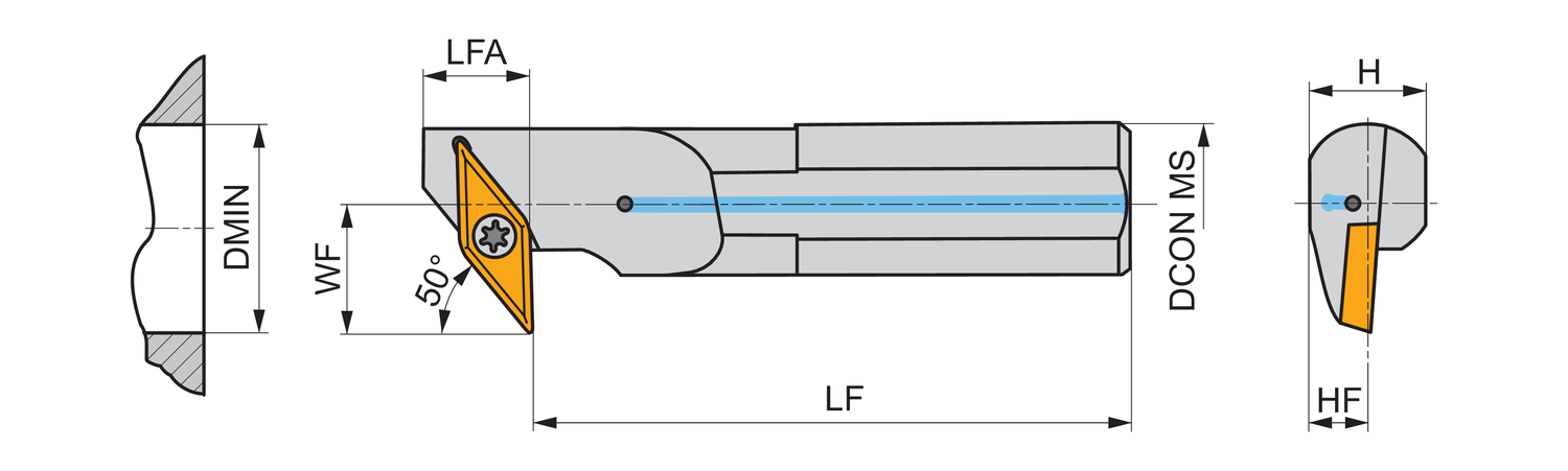 Screw clamp boring bar for holding a 35° rhombus positive insert with an inscribed circle diameter of 7.94mm, 3.18mm thick (ISO designation VC.. 1303.. ), left hand 95° side and end cutting with off-set shank, steel with coolant hole, 20mm diameter x 250mm long for back chamfering