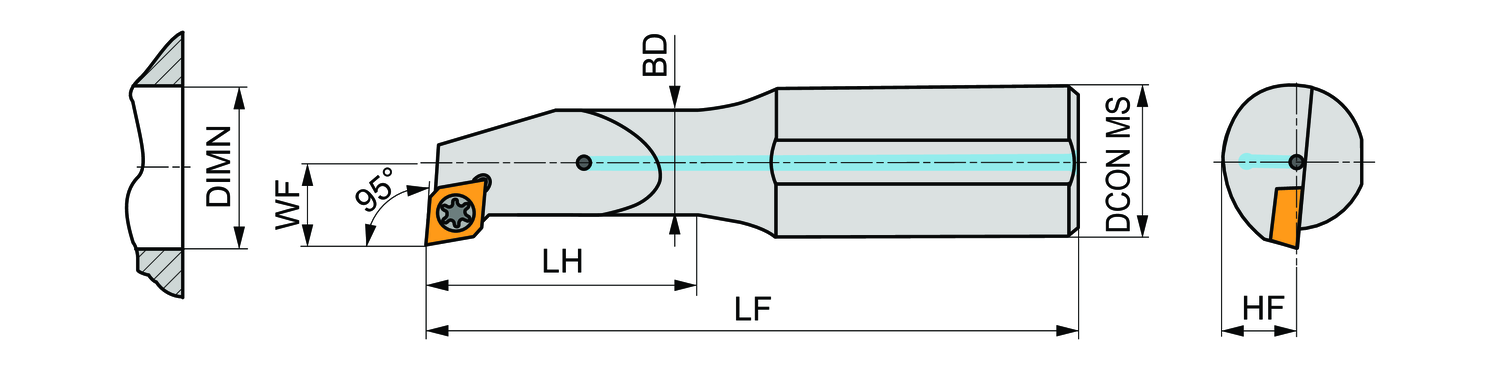 Screw clamp boring bar for holding a 75° rhombus positive insert with an inscribed circle diameter of 5.56mm, 2.38mm thick (ISO designation EP.. 0502.. ), left hand 95° side and end cutting with off-set shank, carbide with coolant hole, 8mm diameter x 110mm long for taper boring and longitudinal boring with and without shoulder
