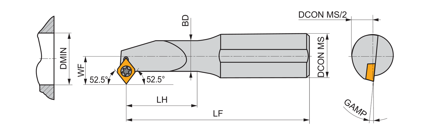 Screw clamp boring bar for holding a 75° rhombus positive insert with an inscribed circle diameter of 5.56mm, 2.38mm thick (ISO designation EP.. 0502.. ), left hand special tool style, steel without coolant hole, 6mm diameter x 100mm long for taper boring, single and multi-directional copy boring and back chamfering