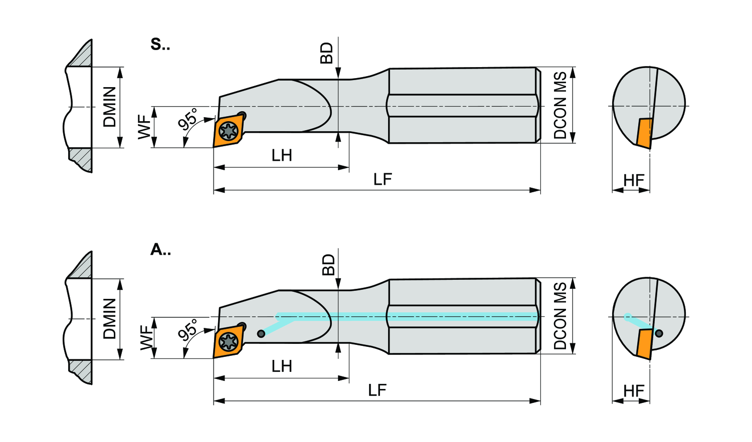Screw clamp boring bar for holding a 75° rhombus positive insert with an inscribed circle diameter of 5.56mm, 2.38mm thick (ISO designation EP.. 0502.. ), left hand 95° side and end cutting with off-set shank, steel without coolant hole, 10mm diameter x 125mm long for taper boring and longitudinal boring with and without shoulder