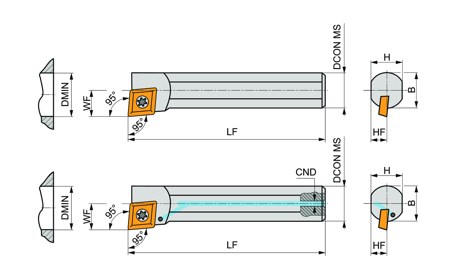 Screw clamp boring bar for holding a 80° rhombus positive insert with an inscribed circle diameter of 7.94mm, 3.18mm thick (ISO designation CC.. 0803.. ), left hand 95° side and end cutting with off-set shank, steel with coolant hole, 10mm diameter x 125mm long for taper boring and longitudinal boring with and without shoulder