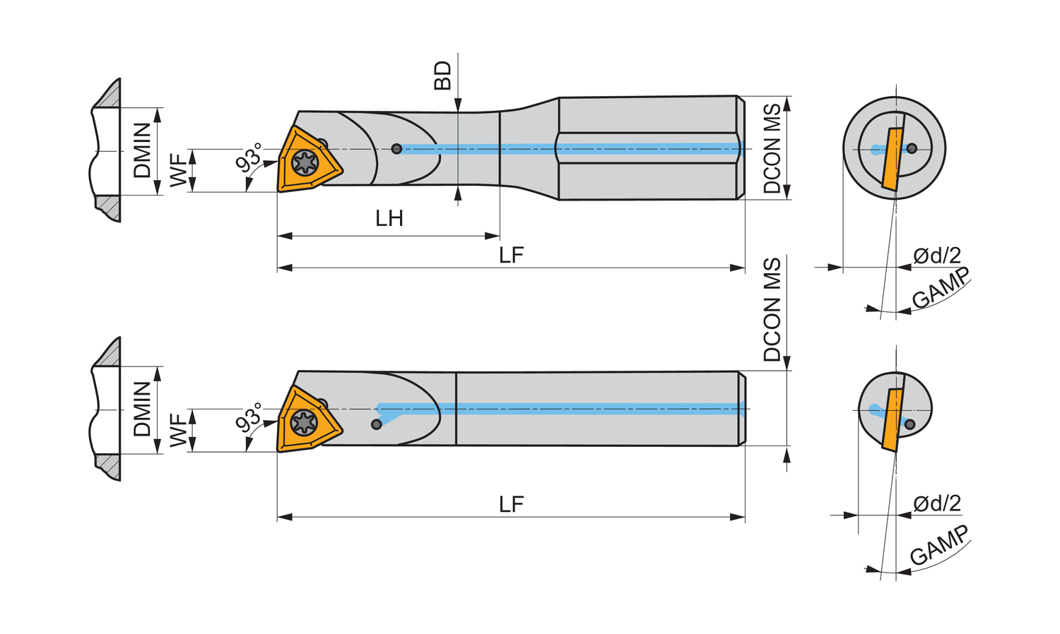 Screw clamp boring bar for holding a 80° trigon positive insert with an inscribed circle diameter of 3.97mm, 1.59mm thick (ISO designation WC.. 0201.. ), left hand 93° end cutting with off-set shank, carbide with coolant hole, 5mm diameter x 80mm long for taper boring and longitudinal boring with and without shoulder