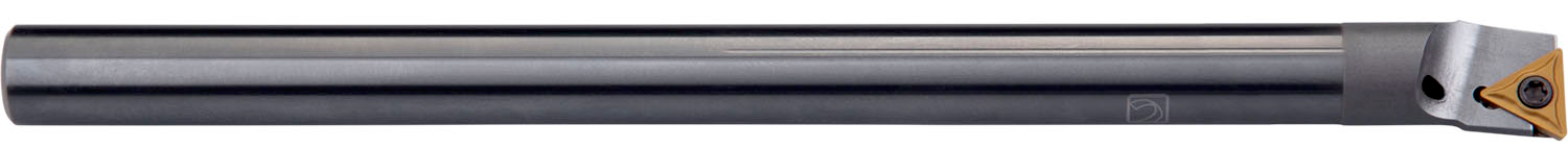 Screw clamp boring bar for holding a triangular positive insert with an inscribed circle diameter of 3.97mm, 1.98mm thick (ISO designation TC.. 06T1.. ), left hand 90° end cutting with off-set shank, carbide with coolant hole, 6mm diameter x 100mm long for taper boring and longitudinal boring with and without shoulder