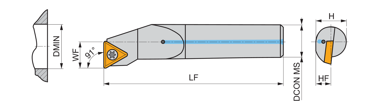 Screw clamp boring bar for holding a triangular positive insert with an inscribed circle diameter of 5.56mm, 2.38mm thick (ISO designation TC.. 0902.. ), left hand 90° end cutting with off-set shank, carbide with coolant hole, 12mm diameter x 180mm long for taper boring and longitudinal boring with and without shoulder