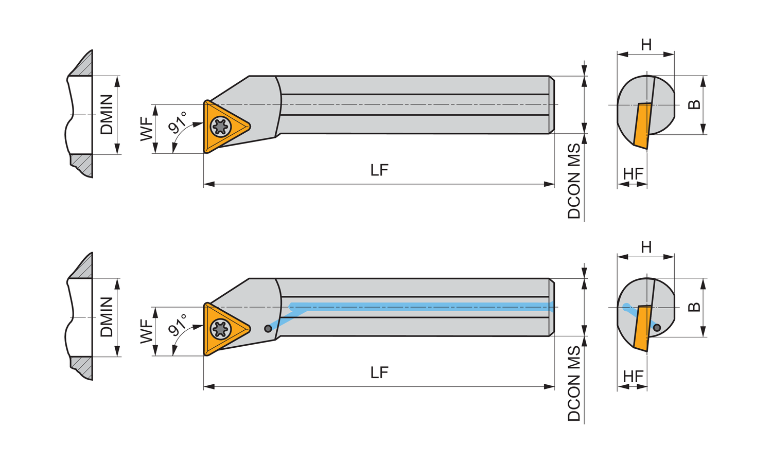 Screw clamp boring bar for holding a triangular positive insert with an inscribed circle diameter of 3.97mm, 1.98mm thick (ISO designation TC.. 06T1.. ), left hand 90° end cutting with off-set shank, steel with coolant hole, 6mm diameter x 80mm long for taper boring and longitudinal boring with and without shoulder
