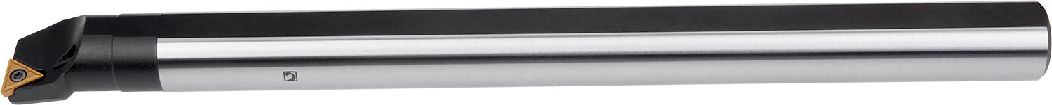 Screw clamp boring bar for holding a triangular positive insert with an inscribed circle diameter of 6.35mm, 2.38mm thick (ISO designation TC.. 1102.. ), right hand 90° end cutting with off-set shank, steel with coolant hole, 20mm diameter x 250mm long for taper boring and longitudinal boring with and without shoulder