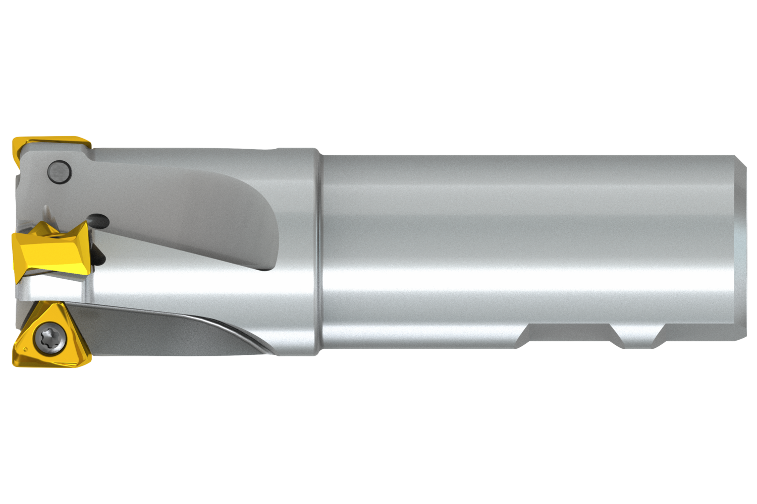 Shoulder face mill with double negative geometry which utilises 4 of TNGX 1606.. double-sided inserts, cutting diameter 1.500" with 90° approach angle and Weldon shank according to DIN 1835B, , through coolant for face milling, shallow shoulder milling, shallow slot milling and helical milling in pre-machined holes