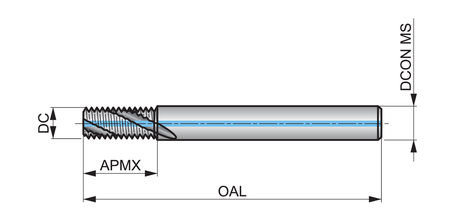 Thread milling cutter, for ISO-Metric thread = M12 with 1.75 mm pitch, dimensions according to DORMER standard with 3 flutes, 9.5mm cutting diameter and 10mm parallel shank according to DIN 6535 HA, solid carbide with Alcrona Pro coating, through coolant holes and 27° helix angle for milling a maximum of 26.25mm long right or left hand internal thread in steel and cast steel, stainless steel, cast-iron, non-ferrous metals, titanium or titanium alloys, chilled cast-iron