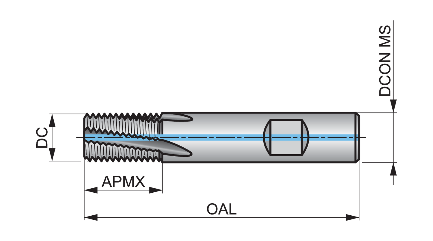 Thread milling cutter, for Unified National Coarse thread = UNC 1/4" with 20 TPI, dimensions according to DORMER standard with 3 flutes, 4.8mm cutting diameter and 6mm Weldon shank according to DIN 6535 HB, solid carbide with Alcrona Pro coating, through coolant holes and 10° helix angle for milling a maximum of 14mm long right or left hand internal thread in steel and cast steel, stainless steel, cast-iron, non-ferrous metals, titanium or titanium alloys, chilled cast-iron