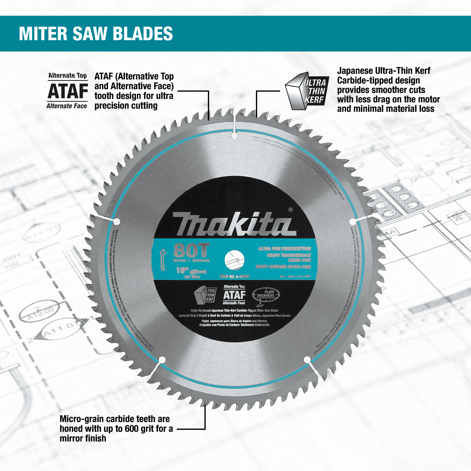 Makita miter saw blades are engineered for precision and performance, cut after cut. The Alternate Top and Alternate Face (ATAF) tooth pattern and the Japanese ultra-thin kerf delivers precision cutting with less material loss and minimal drag on the motor. All Makita miter saw blades are manufactured from fully hardened and expertly hand-tensioned steel. Makita blades are the ideal accessory for your miter saw. ATAF (Alternate Top and Alternate Face) tooth design for ultra precision cutting. Japanese ultra-thin kerf carbide-tipped design provides smoother cuts with less drag on the motor and minimal material loss. Fully hardened and expertly hand-tensioned steel saw plates for true cuts. Micro-grain carbide teeth are honed with up to 600 grit for a mirror finish.