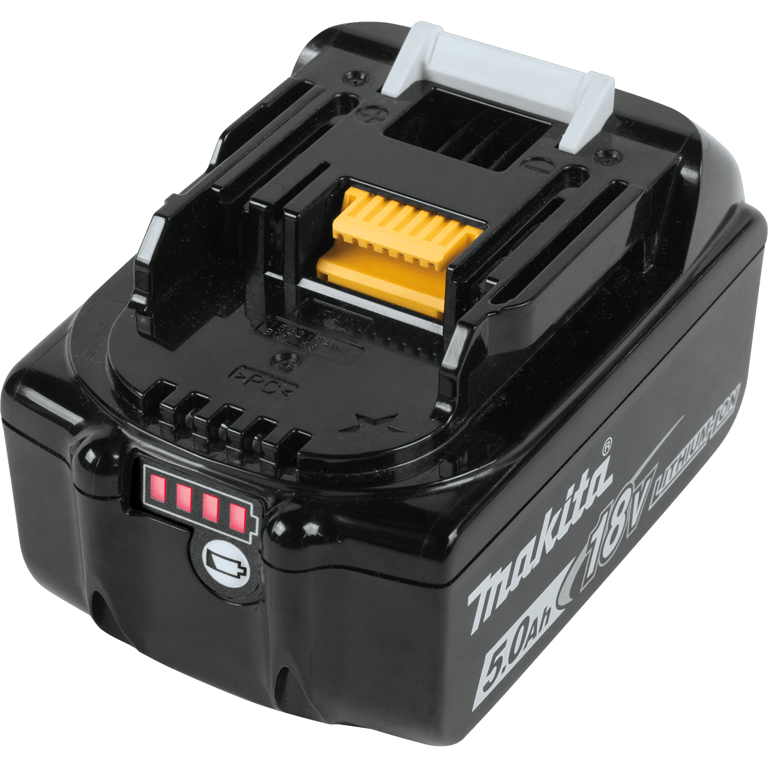 The Makita 18V LXT® Lithium-Ion battery charges faster and works longer than standard lithium-ion batteries, giving you and your cordless tools unmatched performance and productivity to take on the most demanding applications. The Makita 5.0Ah battery has a category-leading charge time of only 45 minutes, so it spends more time working and less time sitting on the charger. The 18V LXT® 5.0Ah battery is compatible only with Star Protection tools, indicated by the Star Symbol™ and/or Yellow Battery Receiver under the tool. Makita 18V Lithium-Ion batteries resist self-discharge so they’re ready for use even after long periods of storage. The Makita Rapid Optimum Charger (sold separately) is a smart-charging system that communicates with the battery during the charging process to monitor current, voltage and temperature. This advanced charging technology helps optimize battery life and deliver a faster charge. In addition, the Charger has a built-in fan to cool the battery for faster and more efficient charging, even in hot weather conditions. For improved tool performance and extended battery life, Makita created STAR Protection Computer Controls™. STAR Protection is communication technology that allows the tool and battery to exchange data in real time and monitor conditions during use to protect against overloading, over-discharging and overheating. Makita, the innovation leader in cordless tool technology, has the world’s largest cordless tool system powered by 18V lithium-ion slide-style batteries. Integrated L.E.D. battery charge level indicator allows user to monitor battery charge. Provides up to 65% more run time per charge compared to BL1830. Reaches full charge in 45 minutes or less. Compatible only with Star Protection tools, indicated by the Star Symbol™ and/or Yellow Battery Receiver under the tool. Battery delivers consistent power and run time in extreme temperatures, even in winter (-4°F/-20°C). Equipped with Star Protection Computer Controls™ to protect against overloading, over-discharging and over-heating. Impact-resistant outer case and shock-absorbing inner-liner are engineered to protect the battery. Sixteen contact terminals maintain a constant connection with the tool to help prevent power loss or fluctuation, even during high-vibration applications. Battery resists self-discharge and remains ready for use even after long periods of storage. Makita 18V Lithium-Ion is the world's largest cordless tool line-up powered by an 18V Lithium-Ion slide-style battery. Makita technology delivers category-leading charge time so the battery spends more time working and less time sitting on the charger (charger not included). 3-year limited warranty.
