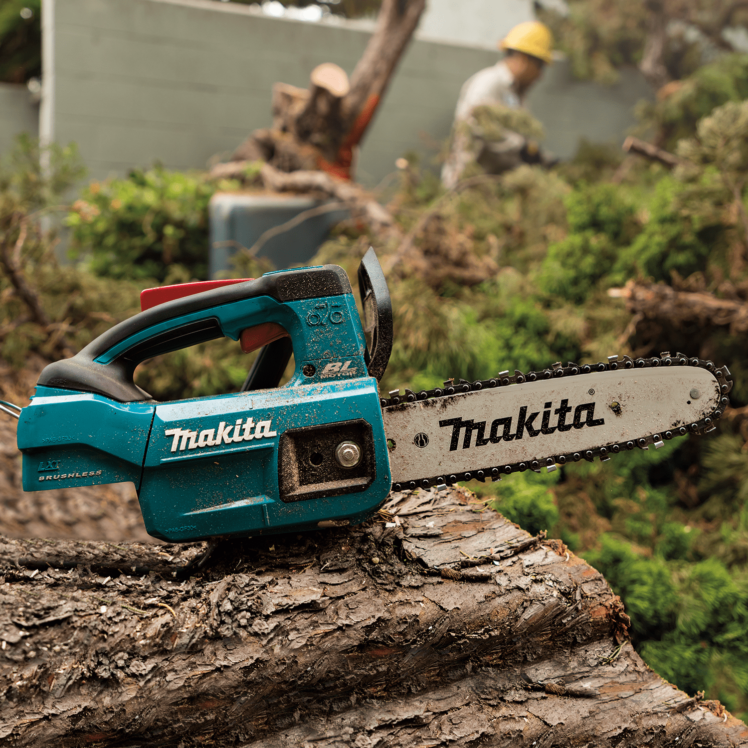 There is growing demand for cordless alternatives to gas-powered outdoor power equipment. Makita is meeting demand with an expanding line of cordless OPE, including the 18V LXT® Brushless 10” Top Handle Chain Saw (model XCU06Z). With zero emissions, lower noise, and considerably less maintenance, the XCU06Z is a welcome solution for cutting and trimming applications, and the compact top-handle design makes it ideal for the professional tree care industry. Powered by one 18V LXT® battery (sold separately) for maximum power, speed and run-time, the XCU06Z uses the strongly-preferred 18V battery platform. And with the efficient Makita outer rotor brushless motor with direct drive system, users get high power efficiency that is equivalent to a gas chain saw. The XCU06Z has a variable speed trigger and high chain speed (0-4,720 FPM) for increased cutting speed, with torque boost mode for cutting dense material. It has zero emissions and reduced maintenance: there's no engine oil to change, no spark plug to replace, and no air filter or muffler to clean. And there's no need to drain the fuel for storage. Simply load the 18V LXT® Lithium-Ion battery (sold separately), and the saw is ready to use. Convenience features include adjustable automatic chain lubrication, built-on lock-off lever to help prevent the chain from accidentally engaging, an electric brake for maximum productivity, and more. It’s part of Makita’s expanding 18V Lithium-Ion system, the world’s largest cordless tool system powered by 18V Lithium-Ion slide-style batteries. Makita 18V Lithium-Ion batteries have the fastest charge times in their categories, so they spend more time working and less time sitting on the charger. For improved tool performance and extended battery life, Makita created Star Protection Computer Controls™. Star Protection is communication technology that allows the Star Protection-equipped tool and battery to exchange data in real time and monitor conditions during use to protect against overloading, over-discharging and overheating. For increased versatility, the tool can also be powered by Makita 18V LXT® and Compact Lithium-Ion batteries with the star symbol on the battery indicating Star Protection inside. Compact top handle design built for the professional tree care industry. Makita-built Outer Rotor BL™ Brushless Motor direct-drive system provides high power efficiency. Variable speed trigger and high chain speed (0-4,720 FPM) for improved cutting performance. Torque boost mode for cutting dense material. Captured bar nut and lateral chain tensioning for convenient operation and maintenance. Adjustable automatic chain lubrication with large oil reservoir. Large oil filling port with view window allows operator to easily add and check bar oil level. Weighs only 7.2 lbs. with battery for operator comfort (battery not included). Built-in L.E.D. on/off switch with auto power-off function; automatically shuts the saw off after 60 seconds for extended battery life. Built-in lock-off lever helps prevent the chain from accidentally engaging. Front hand guard engineered to actuate chain brake when engaged. Electric brake for maximum productivity. Low noise level and zero emissions for operator comfort. Rubberized soft grip top handle is engineered for the user to more easily apply even cutting pressure. Equipped with Star Protection Computer Controls™ to protect against overloading, over-discharging and over-heating. Features Extreme Protection Technology (XPT™) which is engineered to provide increased dust and water resistance in harsh job site conditions. Batteries and charger not included. 3-year limited warranty. Only use genuine Makita batteries and chargers.