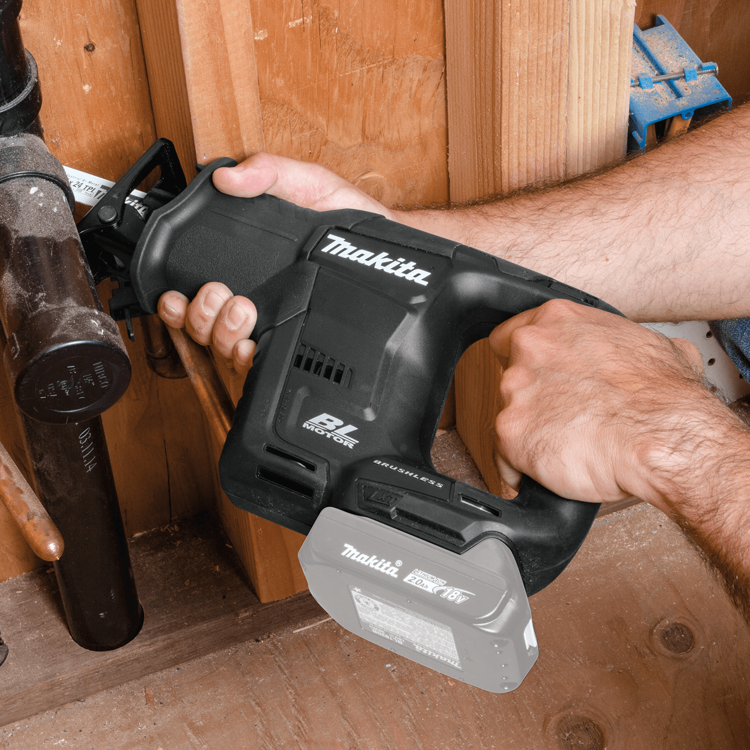 Makita created a new class in cordless with 18V LXT® Sub-Compact tools. Makita Sub-Compact gives users 12V handling with 18V performance, and compatibility with the world’s largest 18V cordless tool system. The XRJ07ZB is a sub-compact solution for cutting and demolition applications in tight spaces. The Sub-Compact Recipro Saw has a compact and ergonomic design at only 12-1/2” and 5.7 lbs. (with 18V LXT® Compact 2.0Ah battery, battery and charger sold separately). The compact size makes it ideal for work in tight spaces, and is a welcome solution for plumbers, electricians, and more. Convenience features include “tool-less” blade change, a reinforced fixed shoe for added durability, electric brake, and a built-in L.E.D. light for improved visibility. It’s equipped with Extreme Protection Technology (XPT™), which is engineered for improved dust and water resistance for operation in harsh conditions. It’s part of Makita’s expanding 18V LXT® system, the world’s largest cordless tool system powered by 18V Lithium-Ion batteries. Makita 18V LXT® batteries have the fastest charge times in their categories, so they spend more time working and less time sitting on the charger. For improved tool performance and extended battery life, Makita created Star Protection Computer Controls™. Star Protection is communication technology that allows the Star Protection-equipped tool and battery to exchange data in real time and monitor conditions during use to protect against overloading, over-discharging and overheating. For increased versatility, the tool can also be powered by Makita 18V LXT® and Compact Lithium-Ion batteries with the star symbol on the battery indicating Star Protection inside. Makita-built brushless motor delivers 0-3,000 strokes per minute combined with a 13/16" stroke length for faster and more efficient cutting. Compact and ergonomic design at only 12-1/2" long. Weighs only 5.7 lbs. with battery (battery not included) for reduced operator fatigue. Ideal for working in tight spaces. "Tool-less" blade change system allows for faster blade installation and removal for increased productivity. Reinforced fixed shoe for added durability. Electric brake for maximum productivity. Built-in L.E.D. light with preglow and afterglow illuminate the work area. Rubberized soft grip handle provides increased comfort on the job. Extreme Protection Technology (XPT™) is engineered for improved dust and water resistance for operation in harsh conditions. Equipped with Star Protection Computer Controls™ to protect against overloading, over-discharging and over-heating. Makita technology delivers category-leading charge time so the battery spends more time working and less time sitting on the charger (battery and charger sold separately). Battery and charger sold separately. 3-year limited warranty. Only use genuine Makita batteries and chargers.