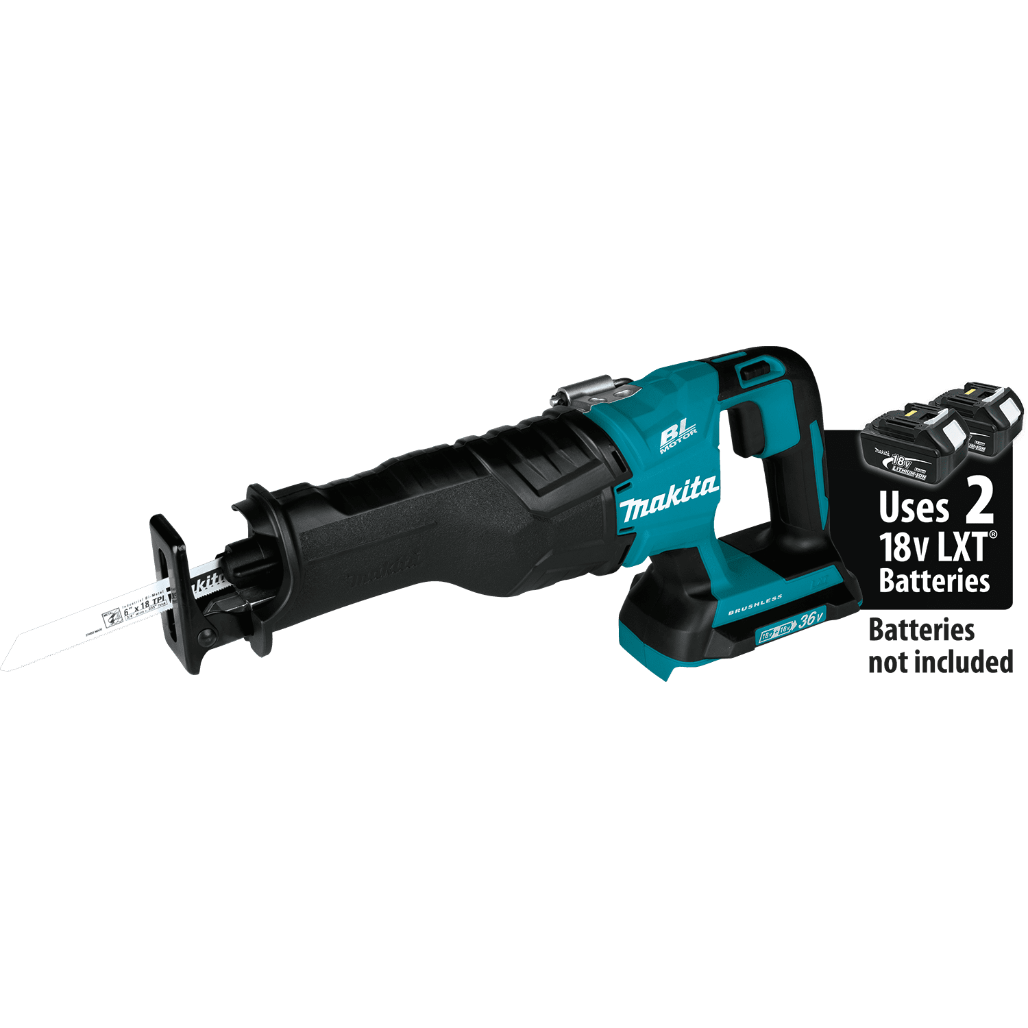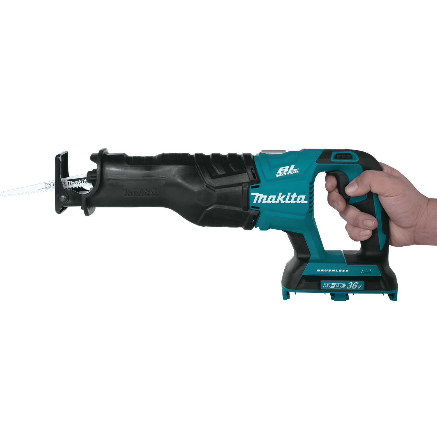 Makita, a pioneer in brushless motor technology and battery innovation, combines both in the 18V X2 LXT® (36V) Lithium-Ion Brushless Recipro Saw Kit. It's powered by two 18V Lithium-Ion batteries (sold separately) for 36V power and performance, and has an electronically-controlled BL™ Brushless motor that matches torque and RPM to the application. Makita 18V X2 means freedom from the cord, even for demanding applications like cutting and demolition that traditionally called for a corded recipro saw. Best of all, users can remain in one battery platform, using the same fast-charging 18V batteries on the XRJ06Z as they use across the Makita 18V LXT® cordless tool line-up. The XRJ06Z is equipped with efficiency features for faster cutting. The long 1-1/4” stroke length increases cutting efficiency, and the refined crank mechanism design minimizes blade deflection and reduces vibration. Convenience features include an L.E.D. light to illuminate the line of cut, retractable tool hook, and “tool-less” blade change for faster blade installation and removal. It’s part of Makita’s expanding 18V Lithium-Ion series, the world’s largest cordless tool line-up powered by an 18V Lithium-Ion slide-style battery. Makita 18V Lithium-Ion batteries have the fastest charge times in their categories, so they spend more time working and less time sitting on the charger. For improved tool performance and extended battery life, Makita created Star Protection Computer Controls™. Star Protection is communication technology that allows the Star Protection-equipped tool and battery to exchange data in real time and monitor conditions during use to protect against overloading, over-discharging and overheating. For increased versatility, the tool can also be powered by Makita 18V LXT® and Compact Lithium-Ion batteries with the star symbol on the battery indicating Star Protection inside. Two 18V LXT® Lithium-Ion Batteries deliver the power and performance of a corded recipro saw without leaving the 18V LXT® platform (batteries not included). X2 LXT® technology delivers up to 155 cuts per charge in 2x10 SPF lumber using two 5.0Ah batteries (batteries not included). Makita-built variable 2-speed brushless motor delivers 0-2,300 (Low) and 0-3,000 (High) strokes per minute. Long 1-1/4" stroke length provides increased cutting efficiency. Refined crank mechanism design minimizes blade deflection and reduces vibration. The BL™ Brushless Motor eliminates carbon brushes, enabling the BL™ Motor to run cooler and more efficiently for longer life. Efficient BL™ Brushless motor is electronically controlled to optimize battery energy use for up to 50% longer run time per charge. The electronically-controlled BL™ Brushless Motor efficiently uses energy to match torque and RPM to the changing demands of the application. Large two-finger varible speed trigger for operator convenience. "Tool-less" blade change system allows for faster blade installation and removal for increased productivity. Electric brake for maximum productivity. Extreme Protection Technology (XPT™) is engineered for improved dust and water resistance for operation in harsh conditions. Rubberized soft grip handle provides increased comfort on the job. Built-in L.E.D. light with preglow and afterglow illuminate the work area. Reinforced fixed shoe for added durability. Retractable tool hook secures the tool when not in use. Ergonomic design at only 17-3/4" long. Weighs only 10.2 lbs. with battery (battery not included) for reduced operator fatigue. Equipped with Star Protection Computer Controls™ to protect against overloading, over-discharging and over-heating. Rapid Optimum Charger communicates with the battery's built-in chip throughout the charging process to optimize battery life by actively controlling current, voltage and temperature (battery and charger sold separately). Rapid Optimum Charger has a built-in fan to cool the battery for faster, more efficient charging (battery and charger sold separately). Makita technology delivers category-leading charge time so the battery spends more time working and less time sitting on the charger (battery and charger sold separately). Compatible with Makita 18V Lithium-Ion batteries with a Star symbol (battery sold separately). Battery and charger sold separately. 3-year limited warranty.