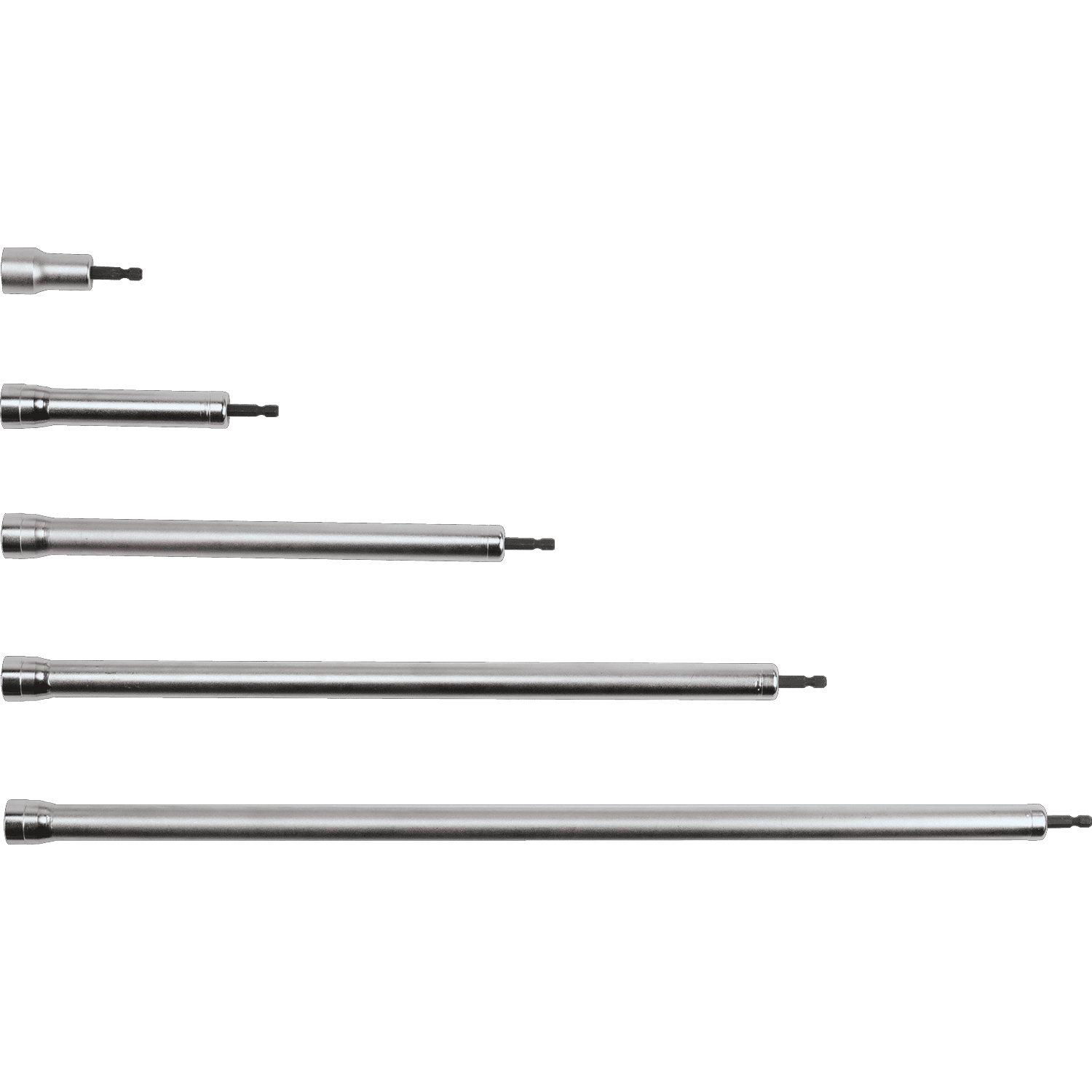 The Makita Hollow Sockets are designed to accelerate overhead fastening work by reducing time-spent hand threading fasteners over threaded rod. The hollow shafts allow long bolts and threaded rod to pass through in fastening applications while the increased socket lengths provide better access to nuts located in high places in ceiling or ductwork. The 1/4” hex shank is press-fit for durability and drops readily into an impact driver or driver-drill for convenient, automated fastening. Impact and drill-ready hollow socket design saves time and speeds up fastening applications over extra long bolts, studs and threaded rod. 12 point socket provides easy fitment over 6 and 12-point fasteners. Additional socket length provides better accessibility to nuts in hard to reach places. Axial press-fit 1/4” hex shank provides greater durability and torsional strength compared to a one-piece hollow socket. Smooth, chamfered inner well prevents shaft from biting and ruining threads for easy fastening and unfastening. Corrosion resistant finish for long life. Lightweight for easy overhead use and reduced wear on the user. Ideal for overhead work on ducts, pipe, studs and threaded rod. 1/4" hex shank works directly with both impact drivers and drill-drivers.