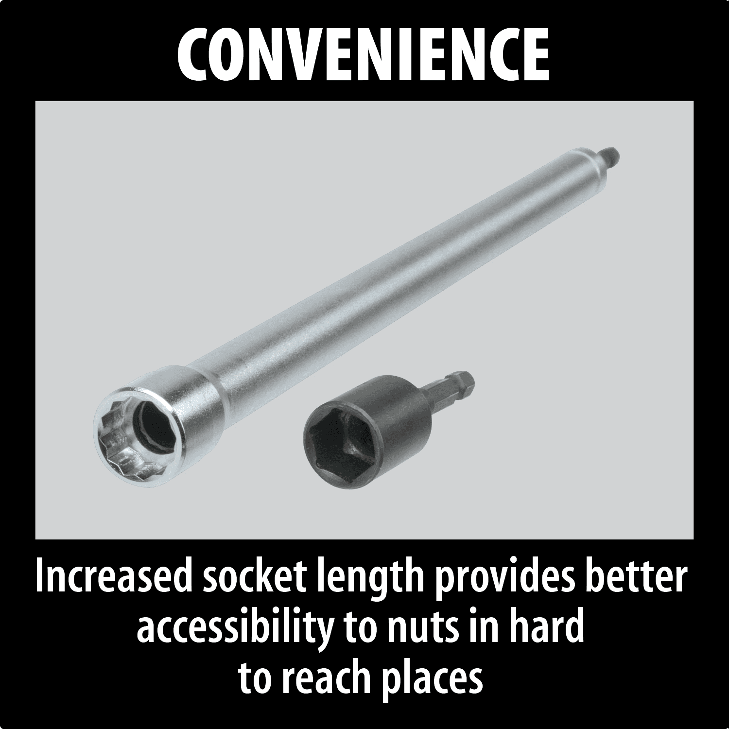 - CONVENIENCE - Increased socket length provides better accessibility to nuts in hard to reach places