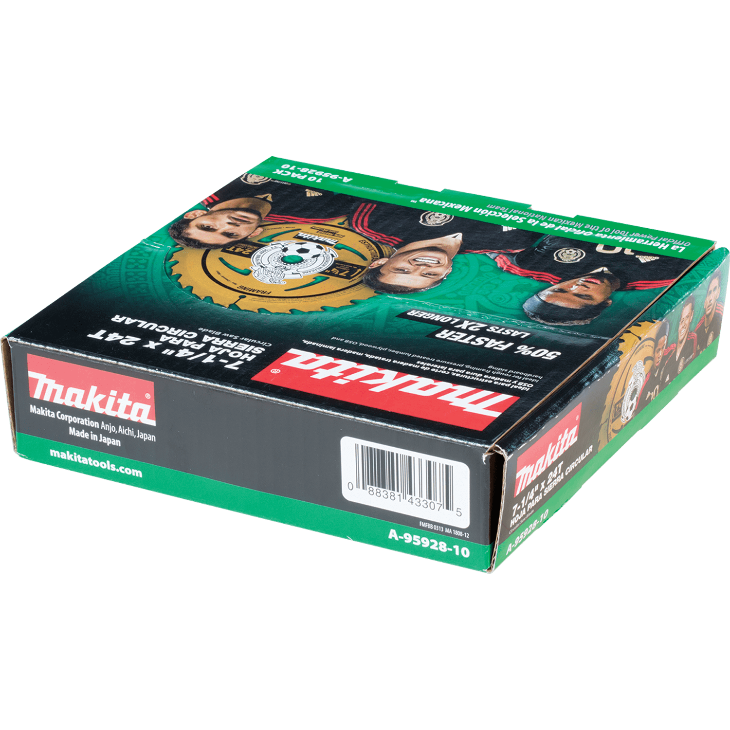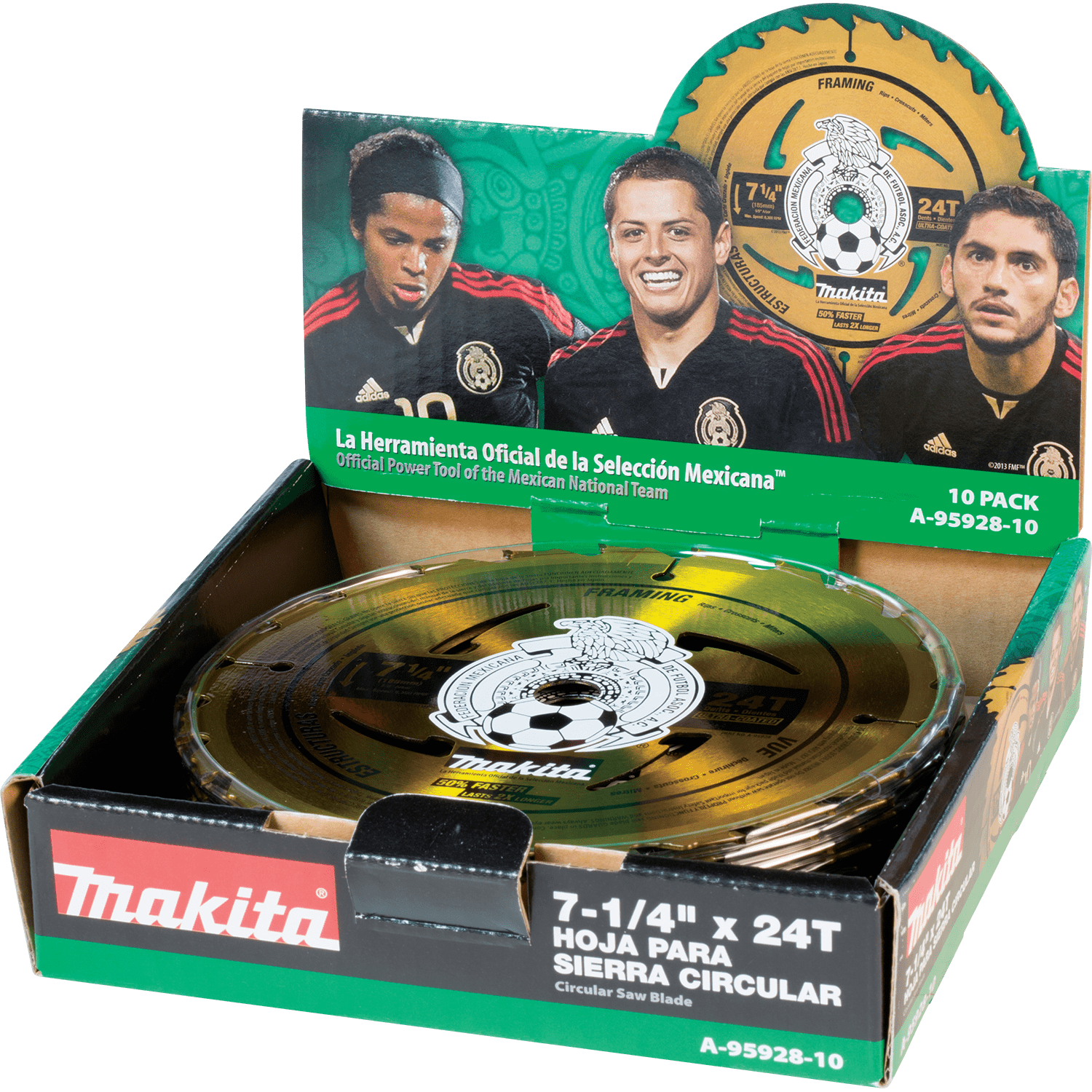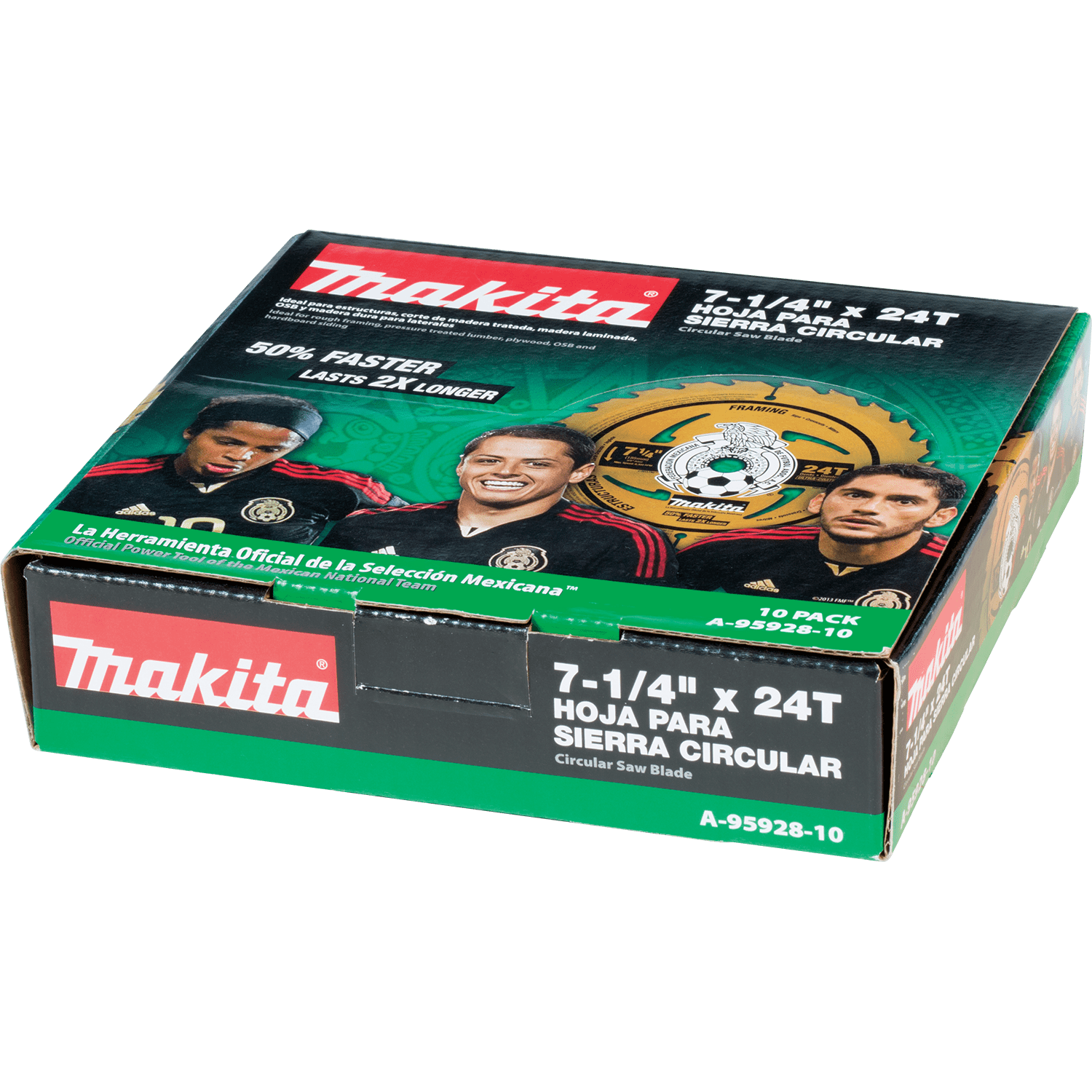 The Makita 7-1/4 in. 24T MNT Ultra-Coated Framing Blade (#A-95928-10) features the logo of the Mexican National Soccer Team (MNT). Makita is the Official Power Tool Sponsor of MNT, and created the one-of-a-kind blade for the growing ranks of contractors who follow MNT soccer. The 7-1/4" 24T MNT Ultra-Coated Framing Blade is engineered with premium features for construction building applications. Each of the blade’s 24 teeth have an innovative "M" shape with two cutting points, so the blade cuts quickly but with the smooth finish typical of a 48-tooth blade. The blade is ultra-coated for reduced pitch build-up, with high-grade C-3 fine-grain tungsten carbide tips for improved durability. The blade is ideal for cutting rough framing lumber, pressure treated wood, plywood, OSB, and other engineered lumber. Exclusive dual-beveled tooth face has two 10° angles creating a more aggressive cut. Greater wear area and more cutting tips increase the life up to 2x more than a traditional framing blade. Ultra-coated blades provide reduced pitch build-up. High grade C-3, fine-grain tungsten carbide tips for improved durability. Japanese ultra-thin kerf carbide-tipped design provides smoother cuts with lessdrag on the motor and minimal material loss. Laser cut heat vents engineered to dissipate heat. Large expansion slots for reduced noise and vibration. Fully hardened and expertly hand-tensioned plate for true cuts. Ideal for general construction applications, including fast, efficient ripping and crosscutting. Engineered for cutting rough framing lumber, pressure treated wood, plywood, OSB, construction material and other engineered lumber.