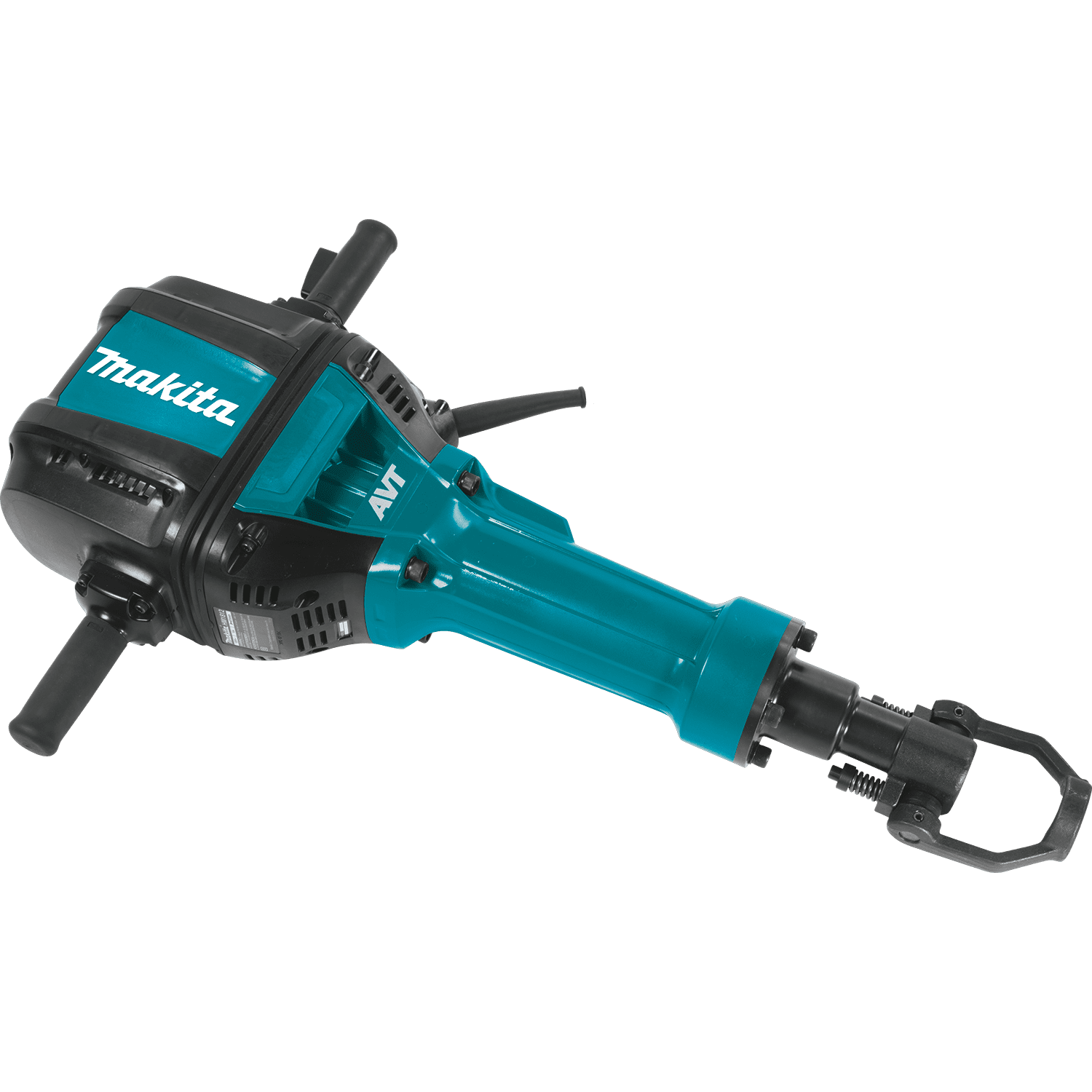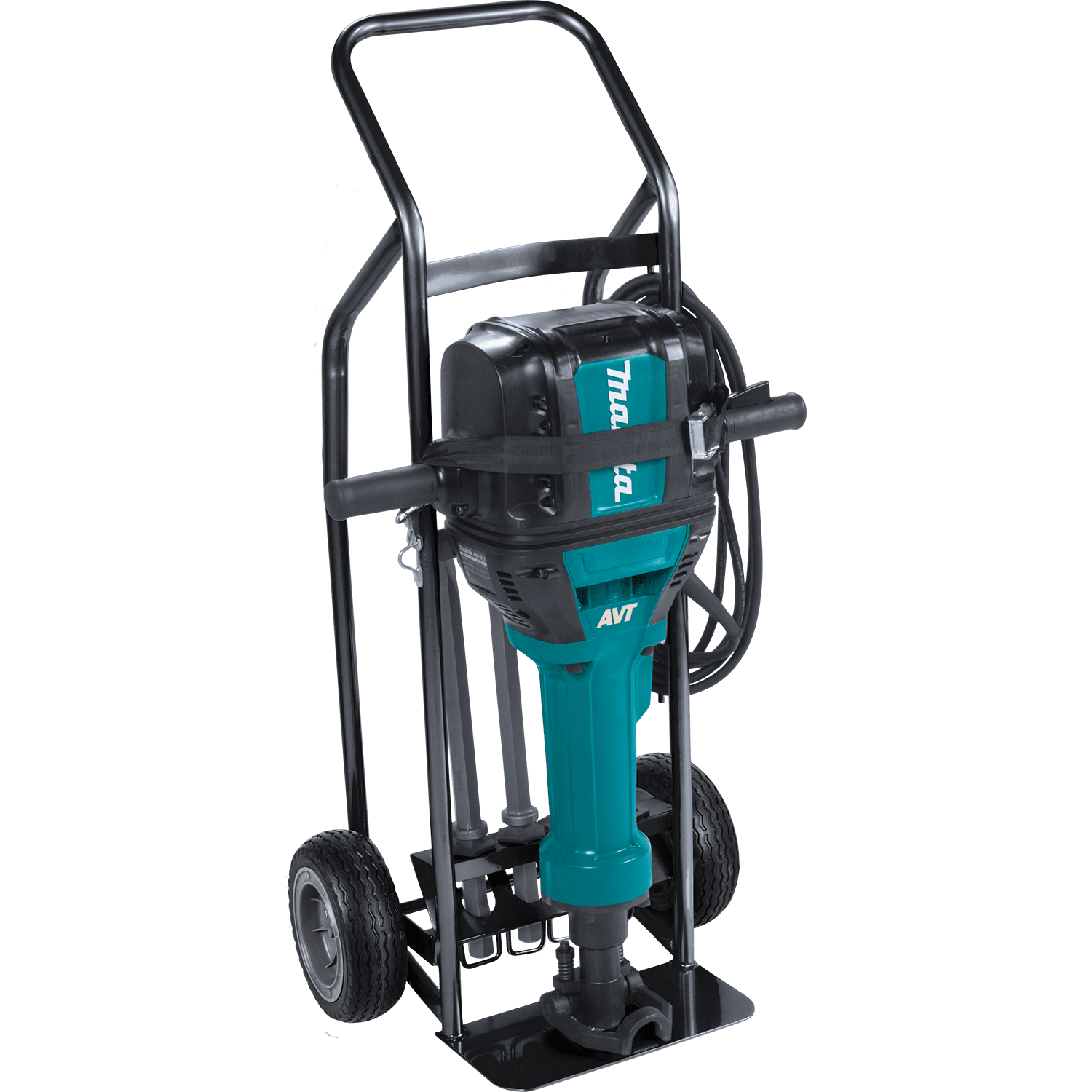 The new 70 lb. AVT® Breaker Hammer is engineered to hit like an air hammer, but with less noise and vibration. It has a powerful 15 AMP motor that delivers a full 53.9 ft.lbs. (73.8 Joules) of impact energy, so contractors get hard-hitting performance. Users also benefit from less noise and lower vibration than an air hammer, and zero hassle with an air hose and compressor. The HM1812 features the latest Advanced AVT® Technology, a synchronized three-component system that more effectively reduces vibration. The internal mechanical counterbalance system, vibration-absorbing housing, and fixed movement handles are engineered for significantly less vibration during concrete breaking applications. Model HM1812X3 is a kit and also includes a Premium Hammer Cart, as well as two 1-1/8" x 20-1/2" Flat Chisels (1-1/8" Hex) and two 16" Self-Sharpening Bull Point bits (1-1/8" Hex). Efficient 15 AMP motor with improved hammer mechanism delivers 53.9 ft.lbs./72.8 joules of impact energy to handle the most demanding applications. Advanced AVT® is a synchronized, three-component system that more effectively reduces vibration in varying conditions resulting in a low 6.5m/s2. Advanced AVT® provides a mechanical counterbalance system which greatly reduces vibration and directs more impact energy to the work surface for increased user comfort and greater productivity. Advanced AVT® provides a vibration absorbing housing which moves independently of the motor and hammer mechanism effectively isolating more vibration away from the user. Advanced AVT® provides rubberized fixed handles which dampen vibration for increased comfort and precision. Soft start is designed to suppress start-up reaction for greater accuracy on start up. "Soft no-load" function automatically reduces the speed of the motor when not in use which helps increase tool life and performance. L.E.D. power light indicates switch failure or cord damage. L.E.D. service light notifies the user approximately 8 hours before brushes need to be replaced. Automatic brush cut-off protects commutator from damage for longer tool life. Cylindrical bit holder allows for the bit holder assembly to be re-positioned should the original bolts and bolt holes become damaged. Recessed lifting handles provide more convenience. Breaker includes a 16.4 ft. power cord and integrated cord guide which positions the power cord away from working area. Premium hammer cart transports breaker hammer and bits for increased convenience.