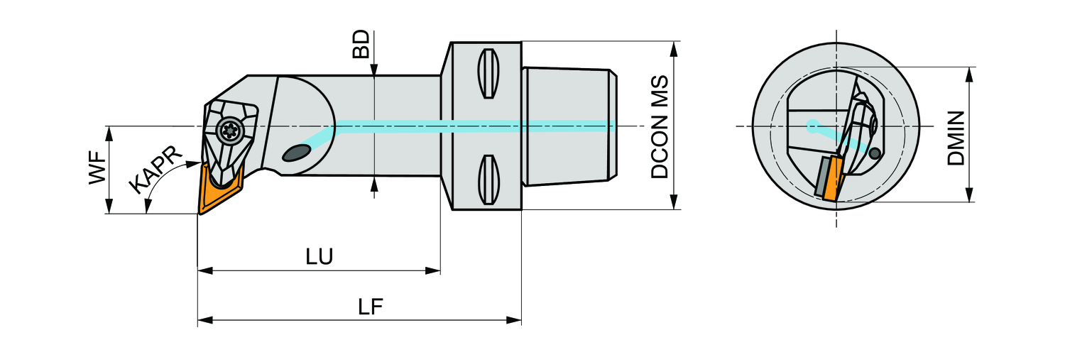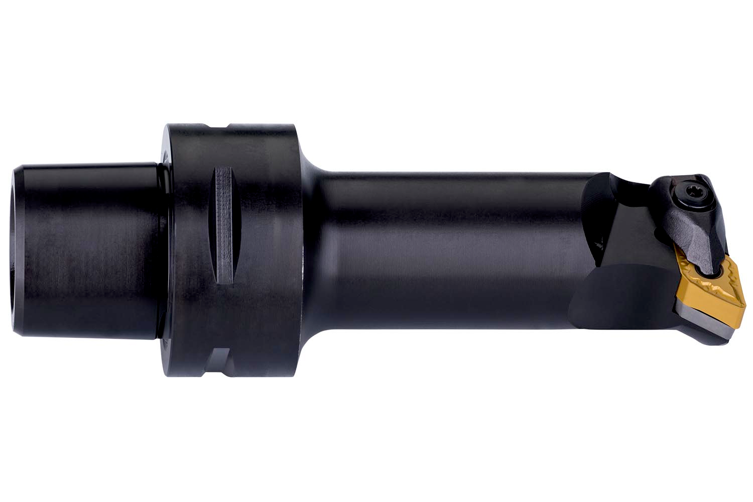 Double clamp boring bar for holding a 55° rhombus negative insert with an inscribed circle diameter of 9.525mm, 4.76mm thick (ISO designation DN.. 1104.. ), left hand 93° end cutting with off-set shank according to ISO 26623 (Polygon Shank Coupling) size C4, with 17mm funtional width and 90mm protruding length for internal chamfering, taper boring, single and multi-directional copy boring and longitudinal boring with and without shoulder