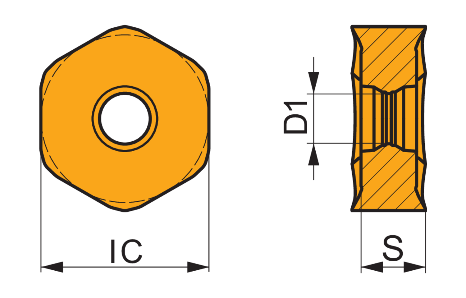 Double-sided milling insert HNGX 0906, hectagonal for a maximum depth of cut of .1969", with " corner radius, an indexing accuracy according to ISO-tolerance class-G and R geometry with rounded cutting edges and facet, M5315 MT-CVD coated WC-Co carbide within ISO-grade range K05-K25 for machining of cast-iron with face mills SHN09C