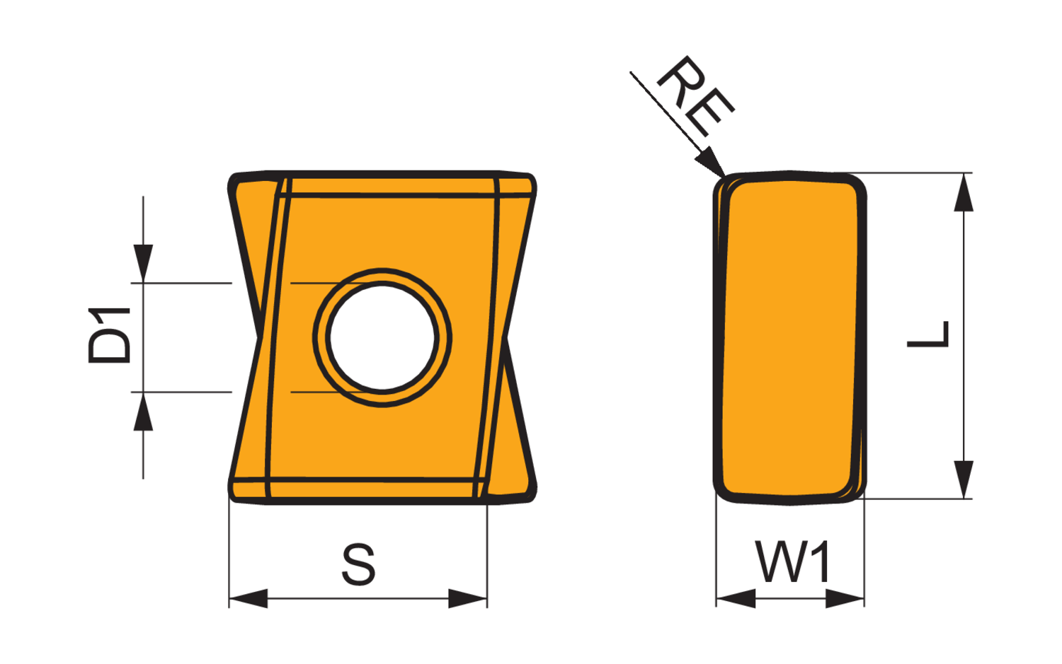 Double-sided milling insert LNEX 1210, rectangular for a maximum depth of cut of 10.0mm, with 0.8mm corner radius, an indexing accuracy according to ISO-tolerance class-E and F geometry with rounded cutting edges and facet, M6330 PVD coated WC-Co carbide within ISO-grade range P20 -P35 for machining of steel with shoulder mills SLN12X