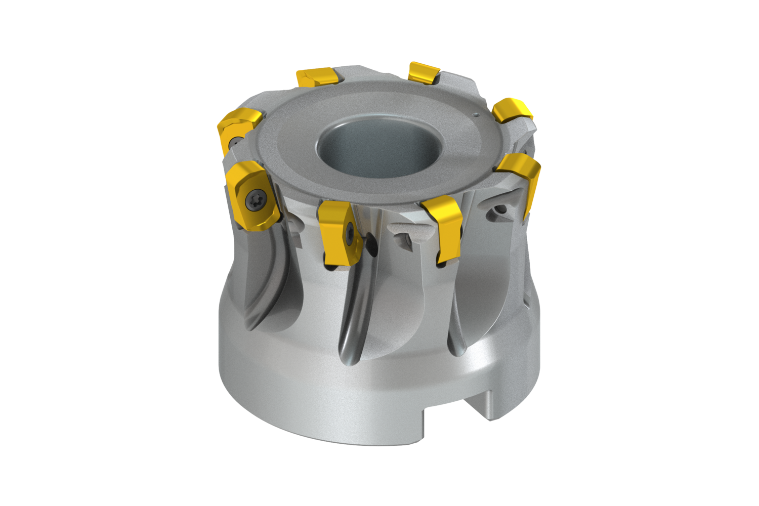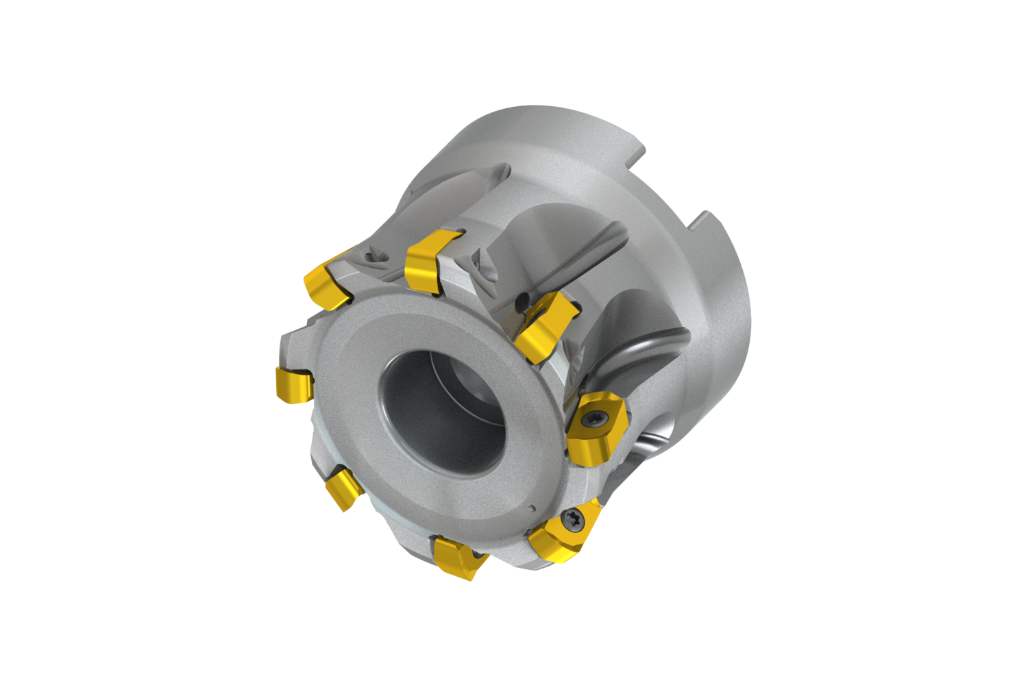 High feed cutter with double negative geometry which utilises 8 of BNGX 10T3.. inserts, cutting diameter 1.800" to maximum 2.000" with 29° approach angle and 0.750" connection bore according to DIN 8030-A, 1.575" functional and, through coolant and differential pitch for face milling, deep shoulder milling, plunge milling, shallow slot milling, copy milling, ramping, progressive plunge milling and helical milling with a maximum depth of cut of 0.039"