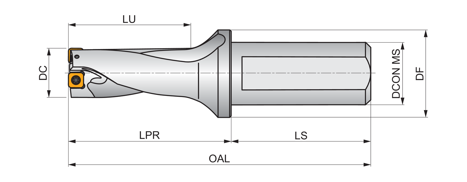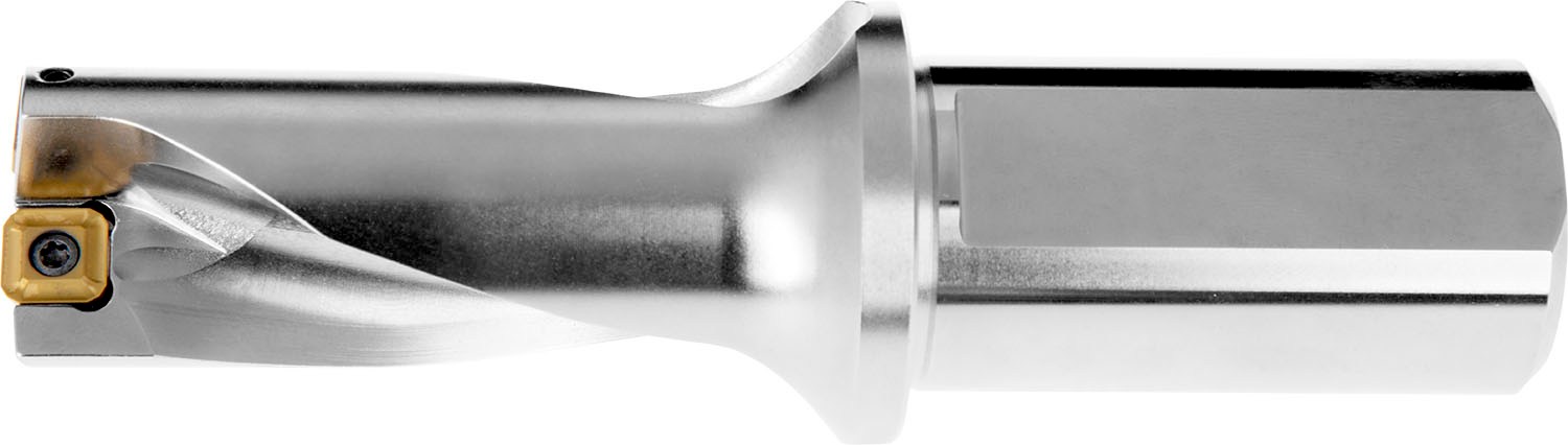 Indexable insert drill which utilises an XPET 0903.. insert in the central pocket and a SCET 09T3.. insert in the peripheral pocket, cutting diameter 1.187'', with a 1.250'' cylindrical shank with flat according to ISO 9766 and through coolant for maximum drilling depths up to 2 x D