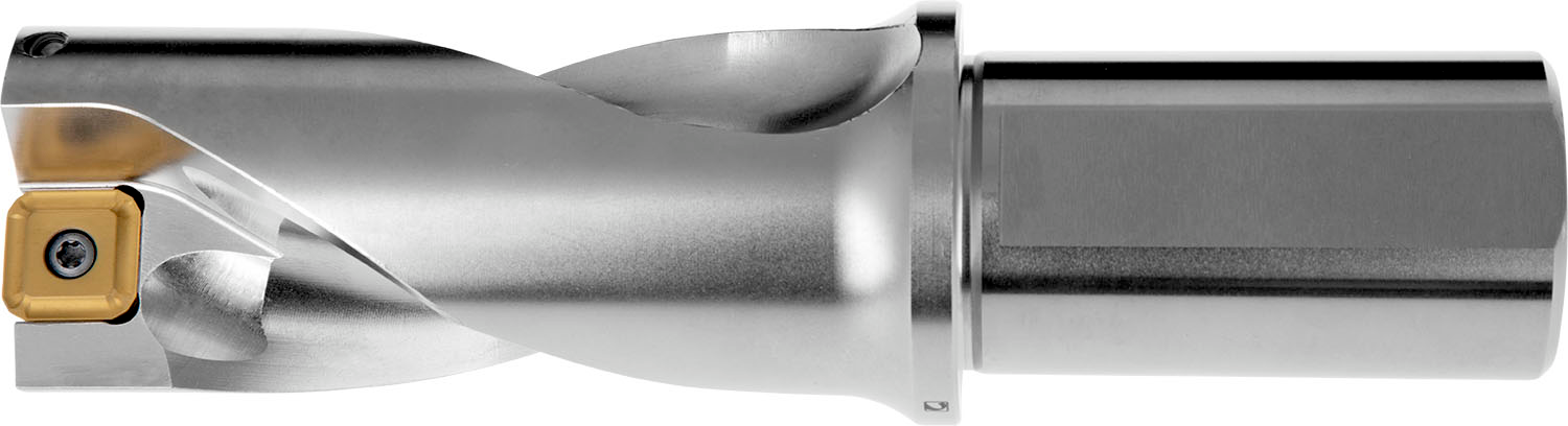 Indexable insert drill which utilises an XPET 1504.. insert in the central pocket and a SCET 1204.. insert in the peripheral pocket, cutting diameter 2.000'', with a 1.500'' cylindrical shank with flat according to ISO 9766 and through coolant for maximum drilling depths up to 2 x D