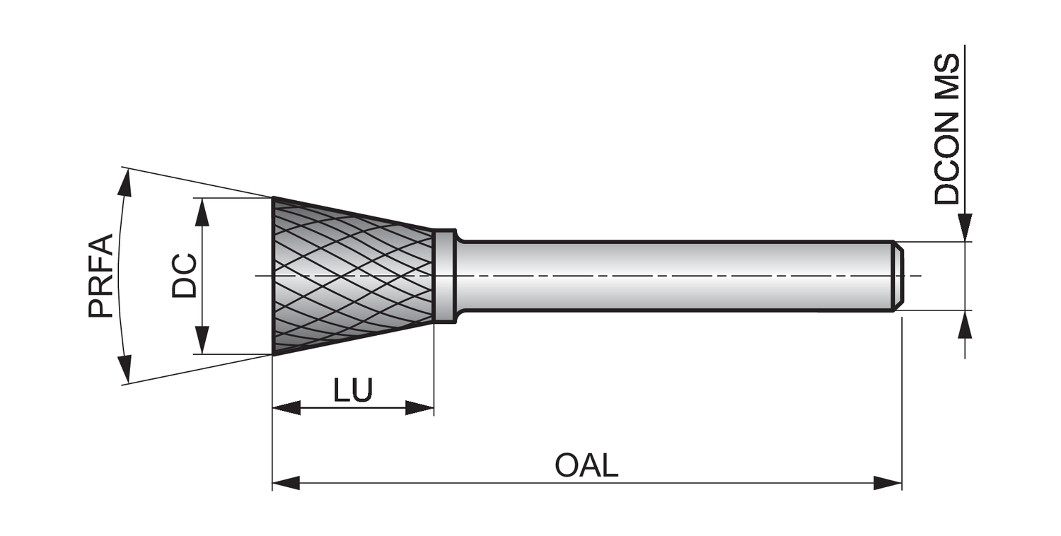 Inverted cone burr (N shape), diameter 5/8" with 3/4" length of cut, 2.1/2" overall length and 1/4" shank, carbide tipped with toughened and hardened steel shank and bright finish, DC double cut flute style with close spaced edges for making inverted v-cuts and rear-side chamfering in steel and cast steel, stainless steel, cast-iron, copper or copper alloys, high-temperature alloys, hardened materials