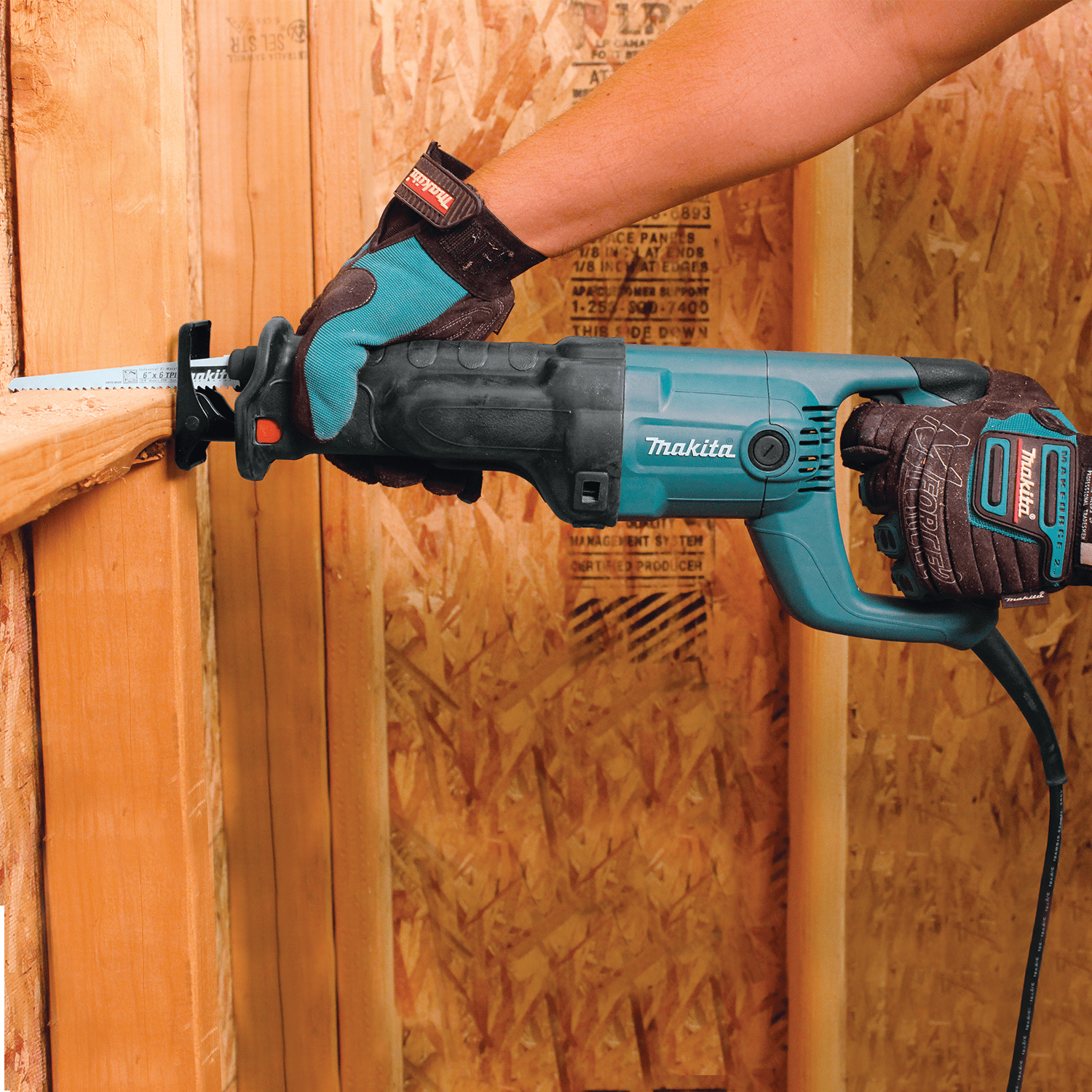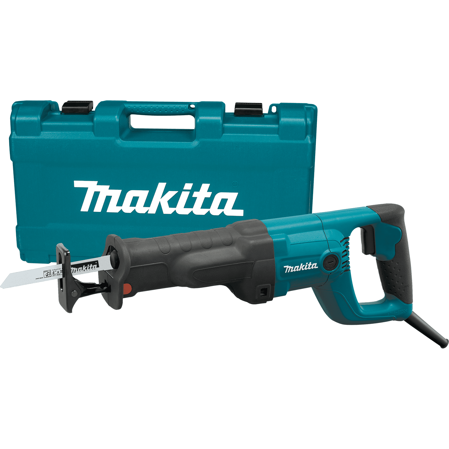 The Makita 11-Amp Reciprocating Saw (model JR3050TZ) combines a powerful 11 AMP motor with less weight (7.3 lbs.) for all day use and improved performance. The 11 AMP motor with variable speed (0-2,800 SPM) has a 1-1/8 inch blade stroke for efficient cutting. It is ideal for metal cutting, wood cutting, drywall and plaster, plastics, remodeling, and demolition applications. The JR3050TZ also features an internal dust blower system to clear debris from the line of cut for improved visibility, with a heavy-duty shoe and “tool-less” blade change for fast blade change and removal. The JR3050TZ is engineered with all ball and needle bearings for longer tool life, and a durable body design with a protective rubber boot to seal the motor and bearings from dust and debris. Versatile Design for a Range of Applications The JR3050TZ is a versatile and powerful reciprocating saw with less weight, and is ideal for builders, roofers, metal fabricators, remodelers, and general contractors. Variable speed trigger for precise cutting in a wide variety of applications. "Tool-less" blade change and shoe adjustment for fast blade installation and removal. Long 1-1/8" stroke for faster cutting. Well-balanced design (only 7.3 lbs.) for reduced operator fatigue and all-day use. Built-in dust blower clears the line of cut for greater accuracy. All ball and needle bearing construction for longer tool life. Large 2-finger trigger for added convenience. Soft grip and handle for increased comfort and control. Ideal for framers, carpenters, electricians, plumbers and general construction. Double insulated.