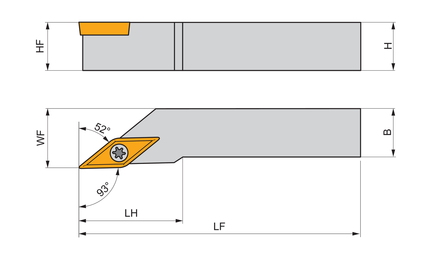 Screw clamp turning tool for holding a 35° rhombus positive insert with an inscribed circle diameter of 1/4'', 1/8'' thick (ANSI designation VB.. 22. ), left hand 93° side cutting with off-set shank, 3/4'' tool height x 3/4'' width x 4.1/2'' long for taper turning, single and multi-directional copy turning and longitudinal turning with and without shoulder