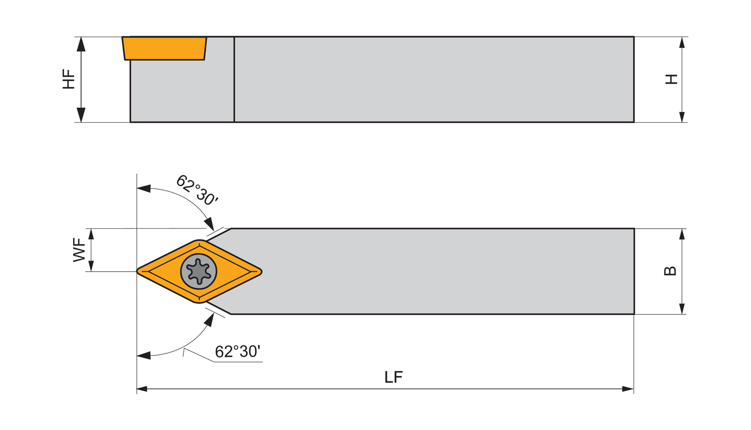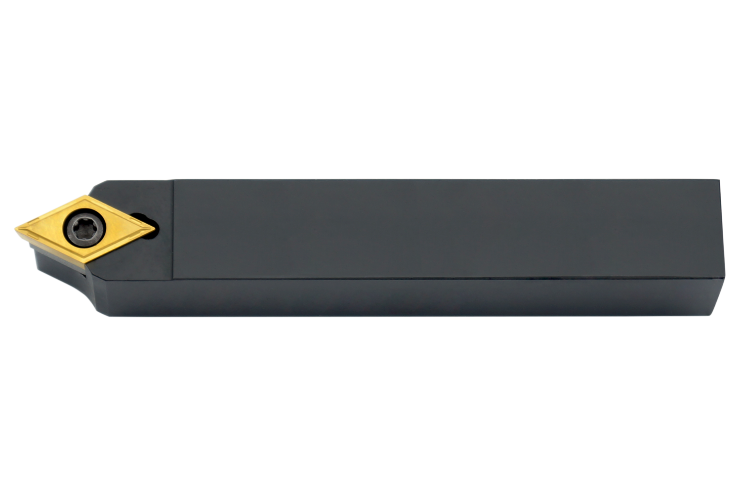 Screw clamp turning tool for holding a 55° rhombus positive insert with an inscribed circle diameter of 3/8'', 5/32'' thick (ANSI designation DC.. 32.5. ), neutral hand 62.5°, left and right side cutting, 3/4'' tool height x 3/4'' width x 4.1/2'' long for single and multi-directional copy turning