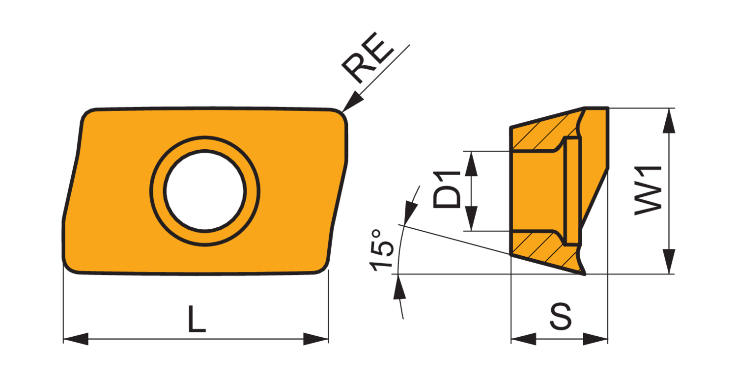 Single-sided milling insert ADMX 1606, 85° parallelogram for a maximum depth of cut of .5118", with .063" corner radius, an indexing accuracy according to ISO-tolerance class-M and M geometry with rounded cutting edges and facet, M8330 PVD coated fine grained WC-Co carbide within ISO-grade ranges P20-P40 and K20-K40 for machining of steel and cast-iron with shoulder mills SAD16E or shoulder mills with extended flute J(T)-SAD16E