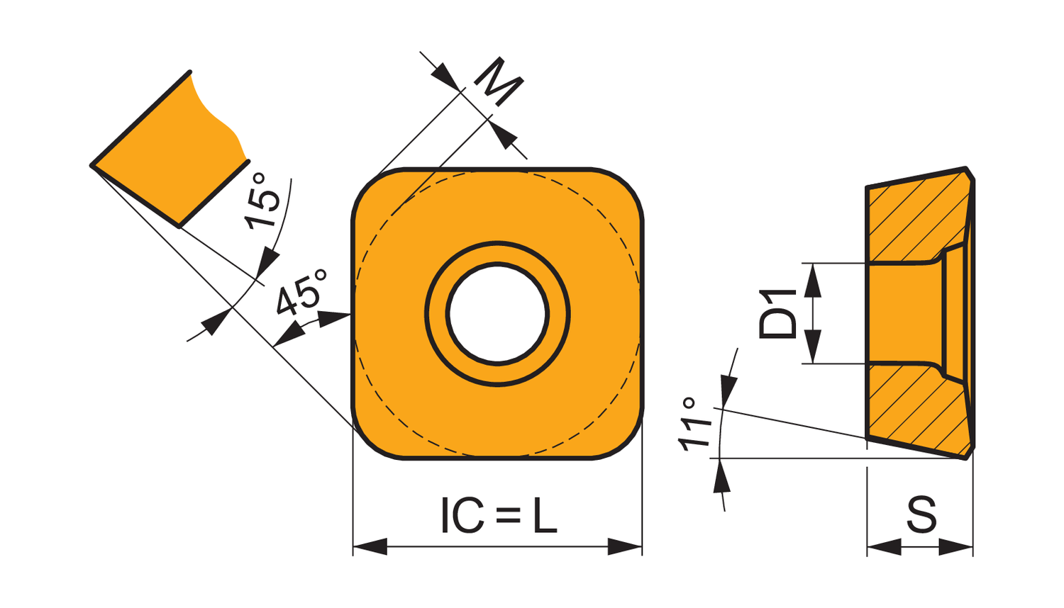 Single-sided milling insert SPET 1204 with chip-breakers, square for a maximum depth of cut of .4724", with .0315" corner radius, an indexing accuracy according to ISO-tolerance class-E with rounded cutting edges and facet, M8330 PVD coated fine grained WC-Co carbide within ISO-grade range P20-P40 for machining of steel with shoulder mills with extended flute J(T)-SSAP