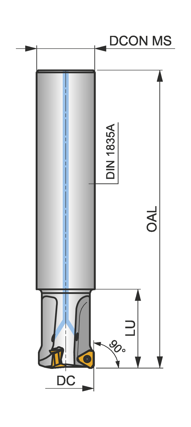 Shoulder face mill with double negative geometry which utilises 2 of TNGX 1606.. double-sided inserts, cutting diameter 1.250" with 90° approach angle and parallel shank according to DIN 1835A, , through coolant for face milling, shallow shoulder milling, shallow slot milling and helical milling in pre-machined holes
